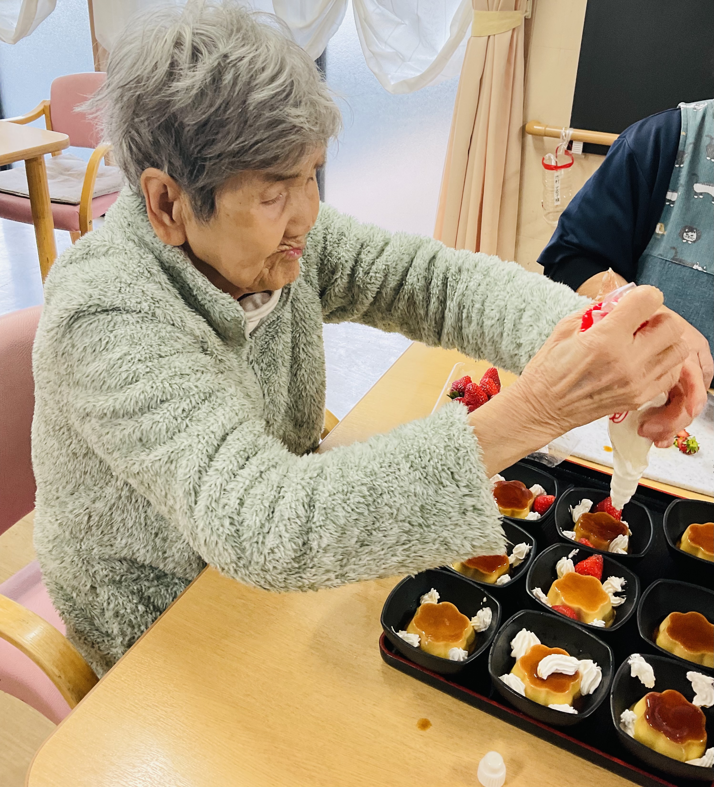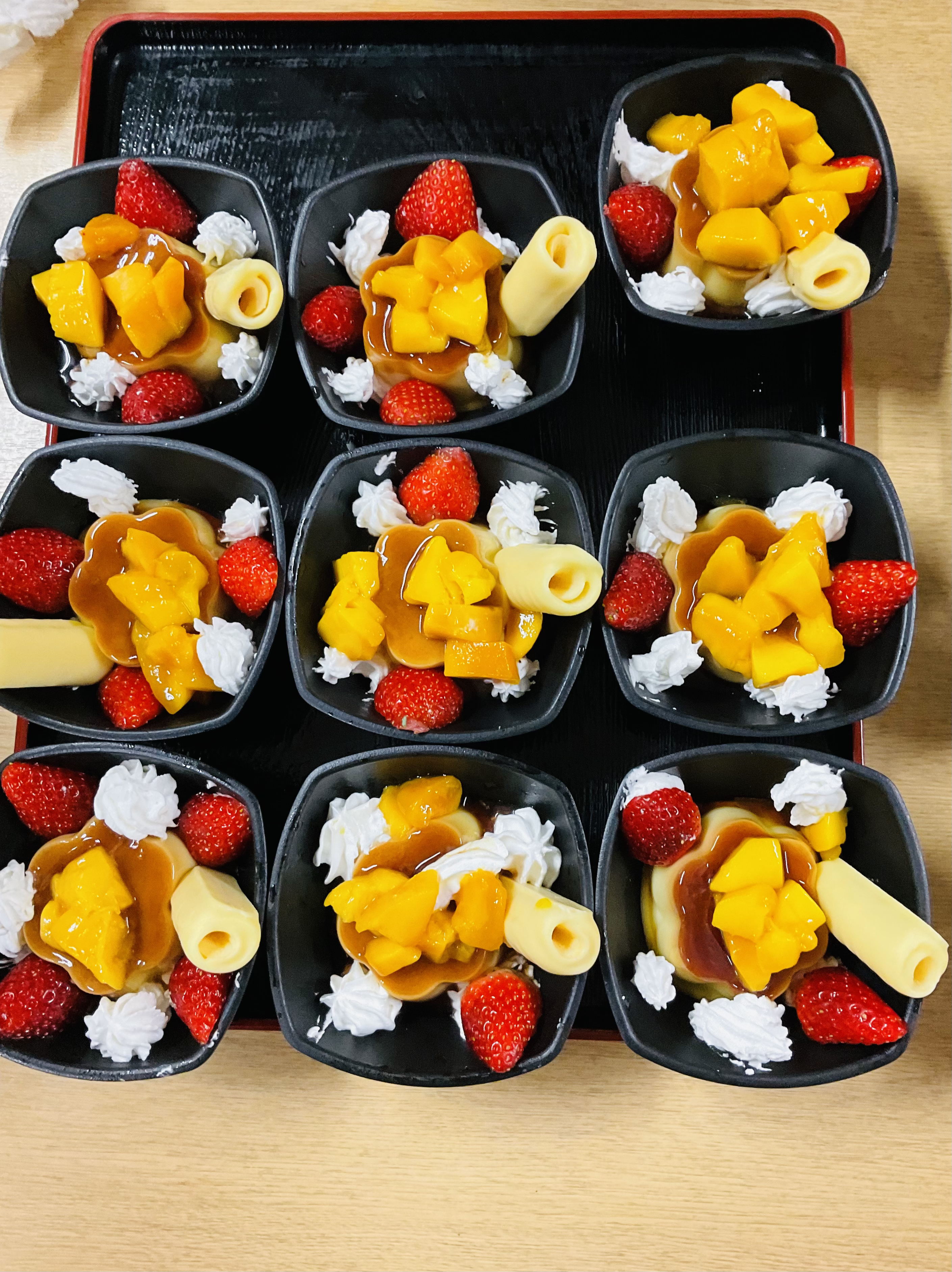 デザートは🍮利用者様にも手伝っていただき、プリンアラモードを作りました。