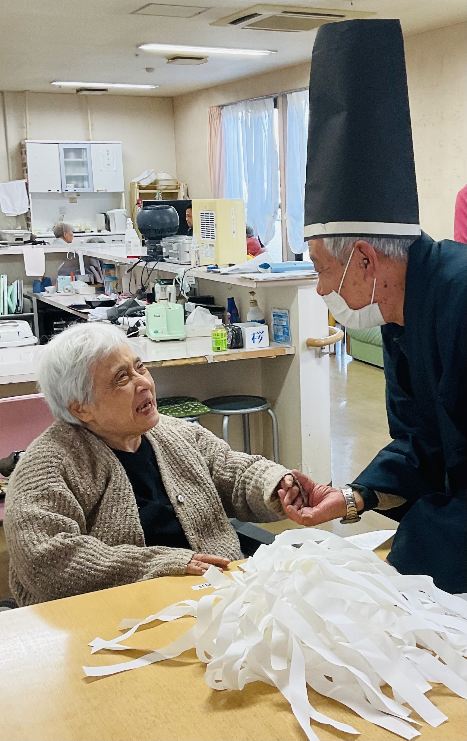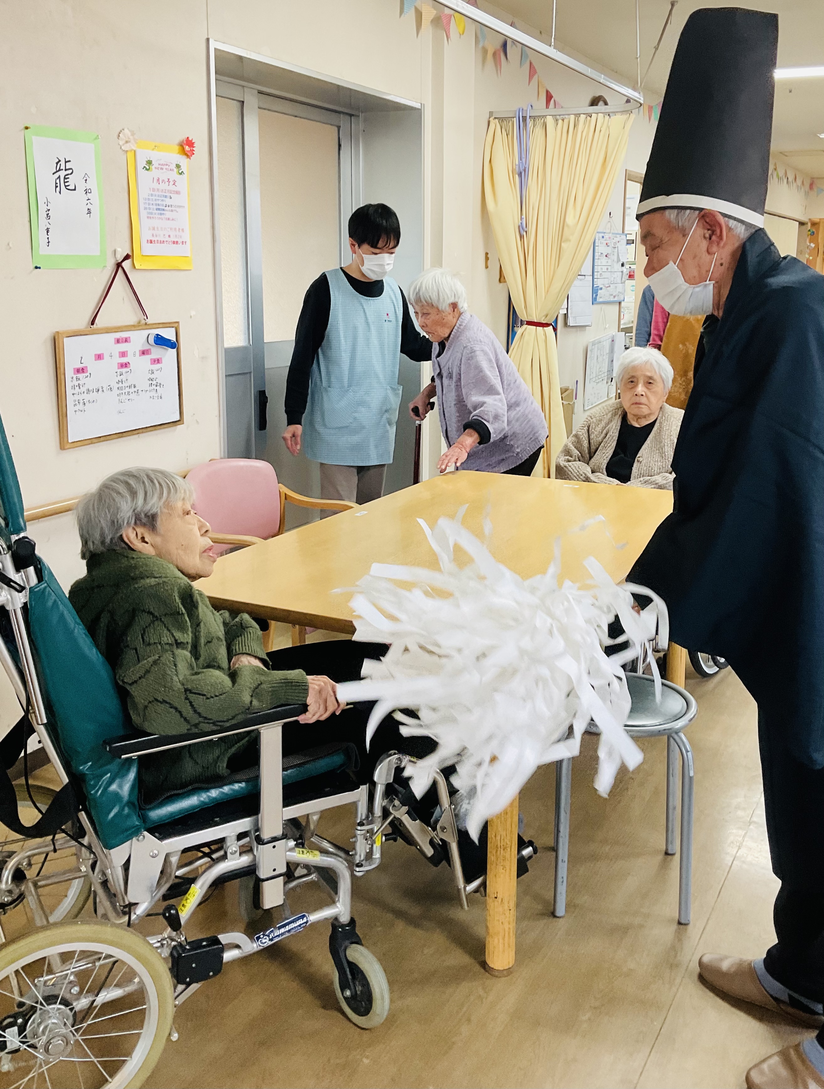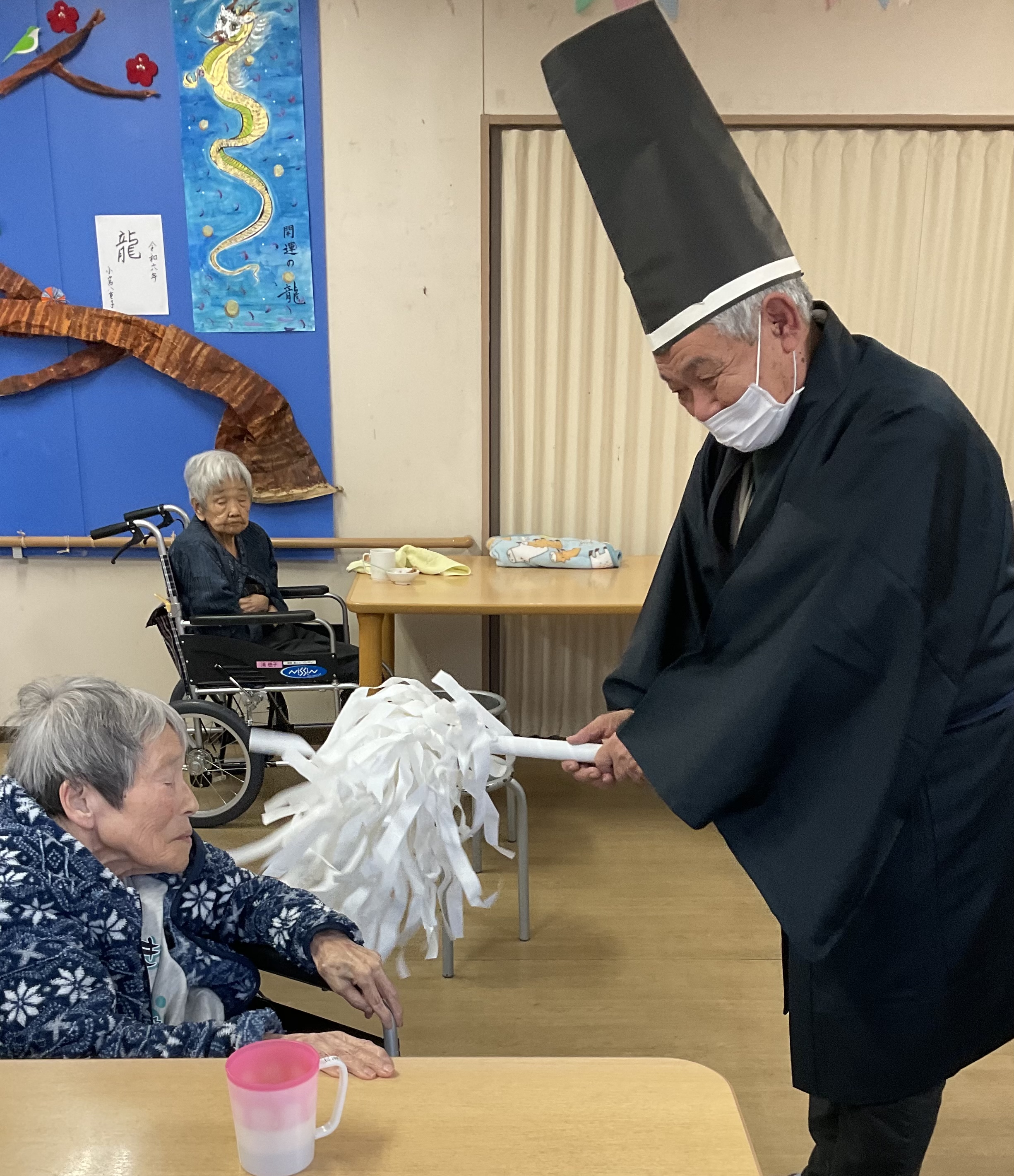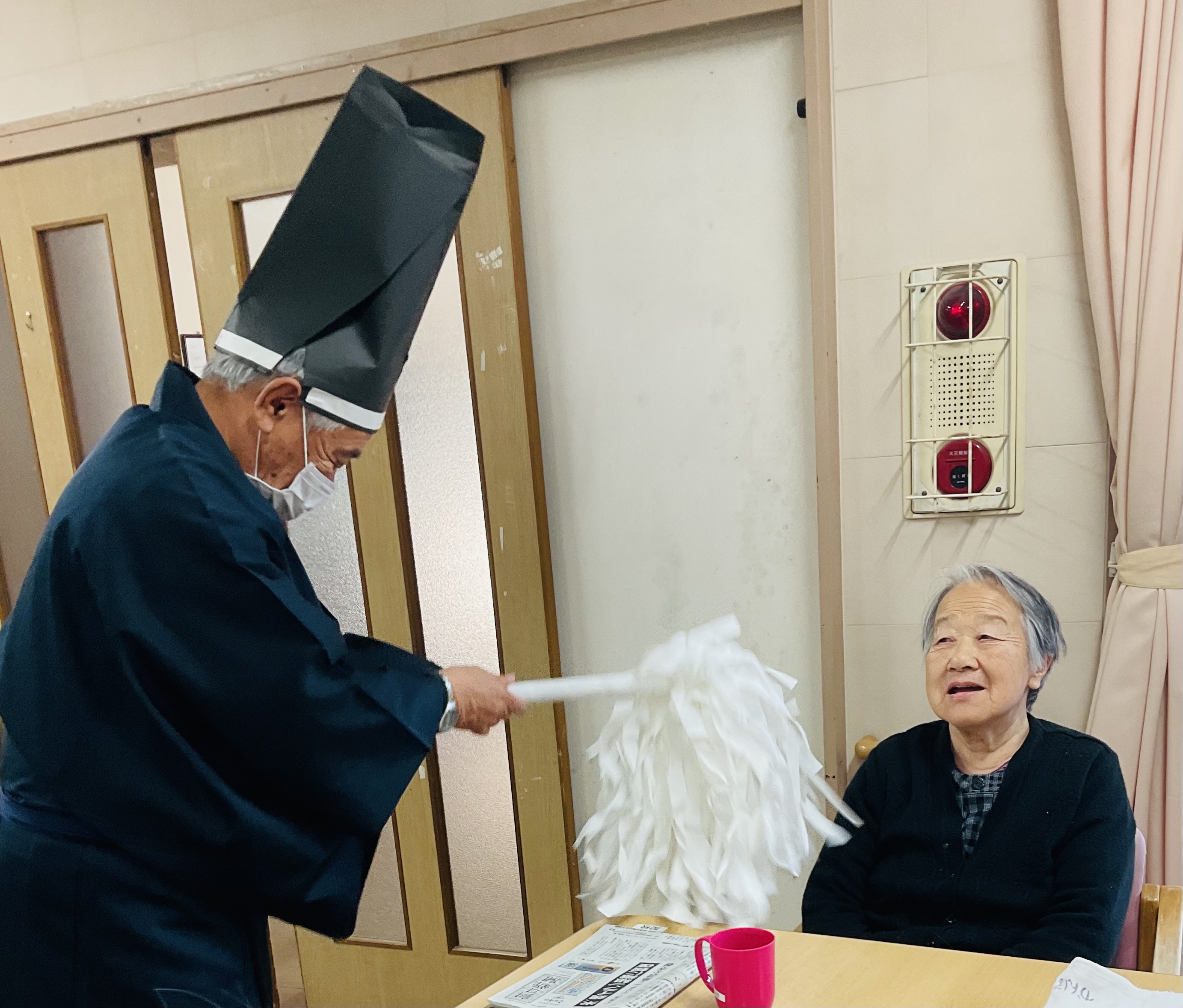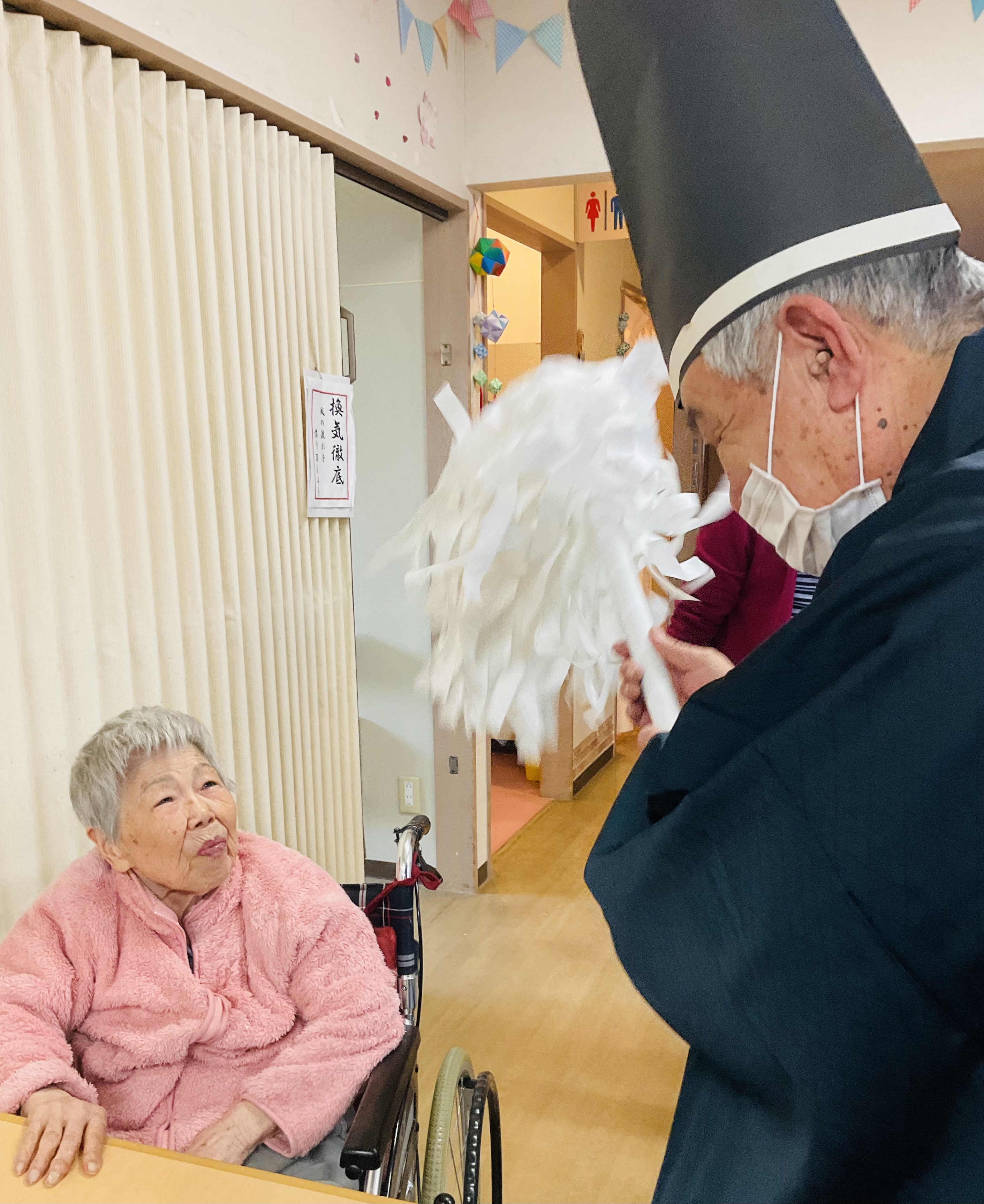 ご利用者様の息子様が神主になり、一人ひとりにお祓いをして下さいました。