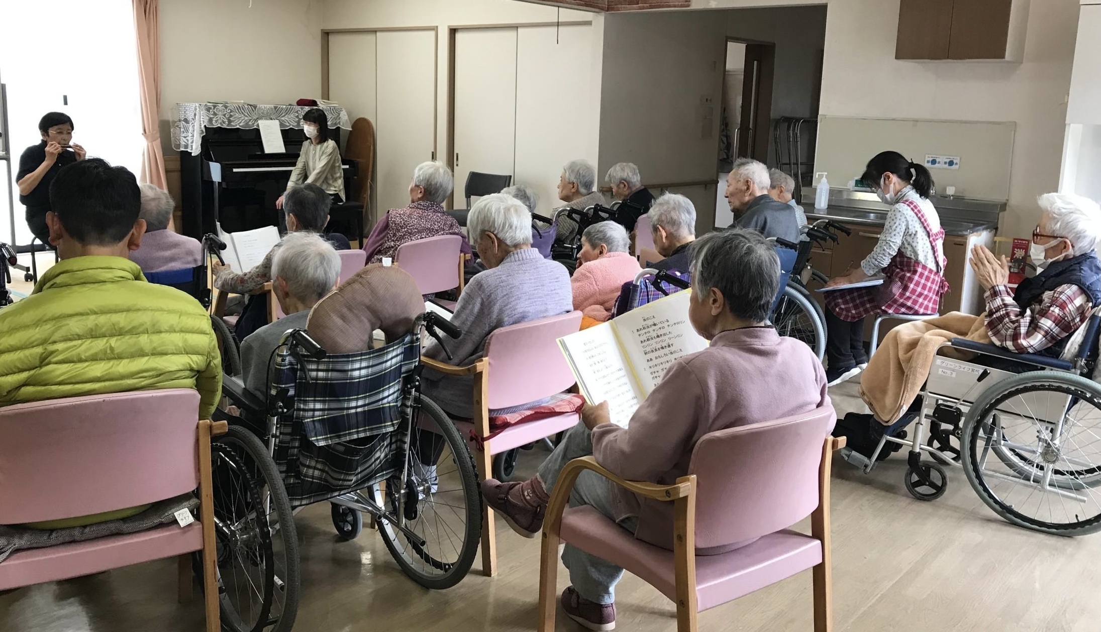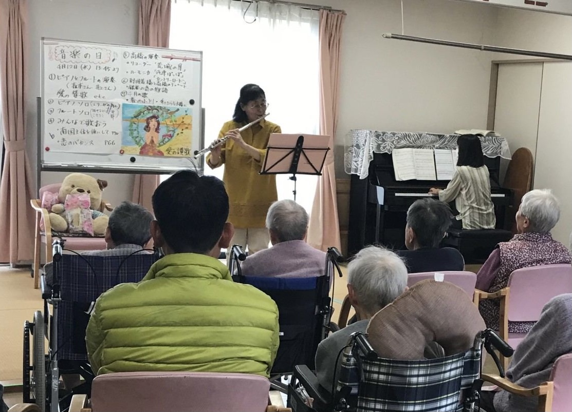 音楽の日も再開し、少しずつ楽しみの日が、増えてきました。行事担当の職員も張り切っています。今後、ピアノの先生とフルートの先生、それに職員のさんの3人で、音楽の幅がどんどん拡がりそうです。音楽聞いて心豊かに過ごしていただきたいと思います。