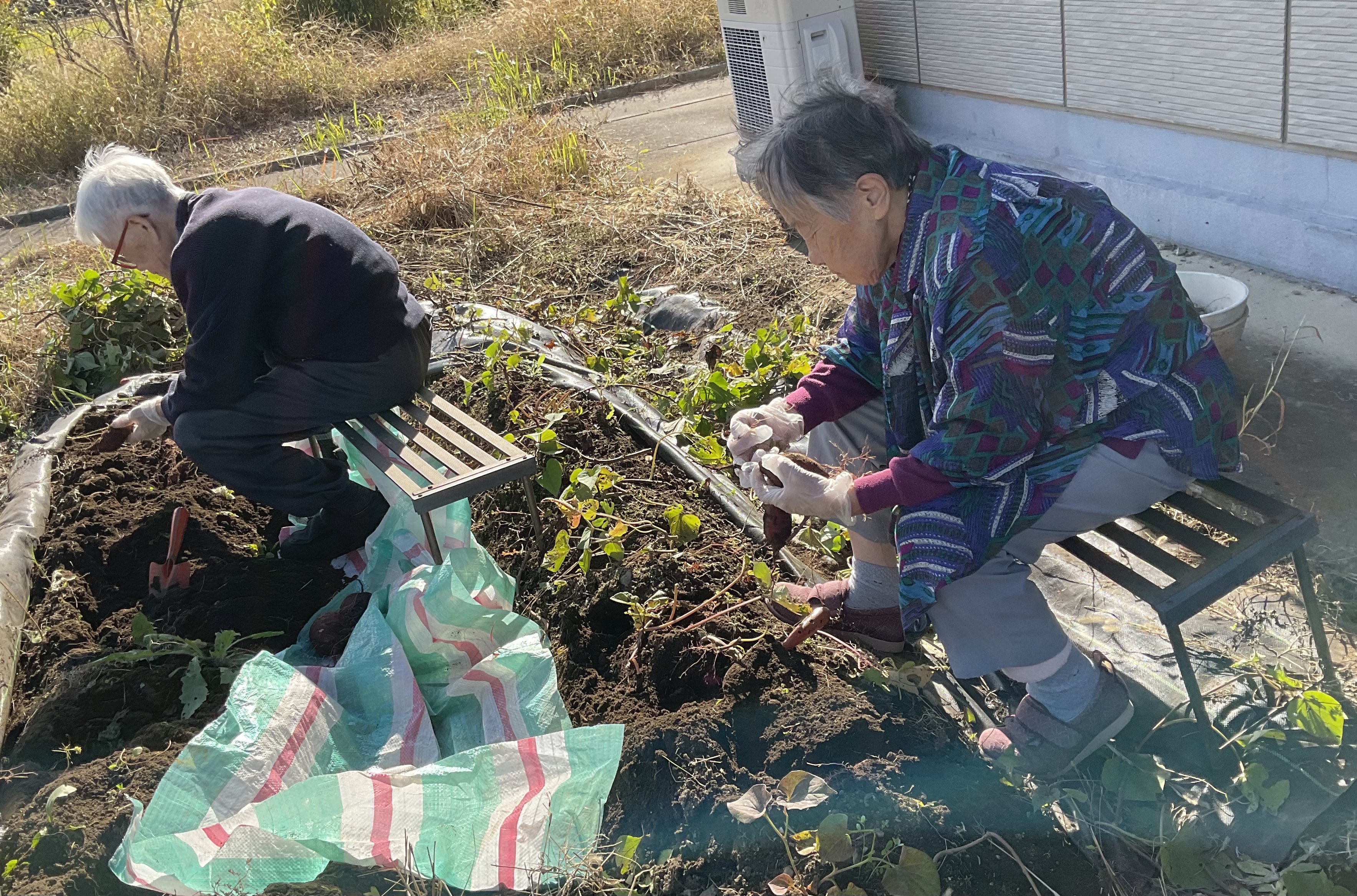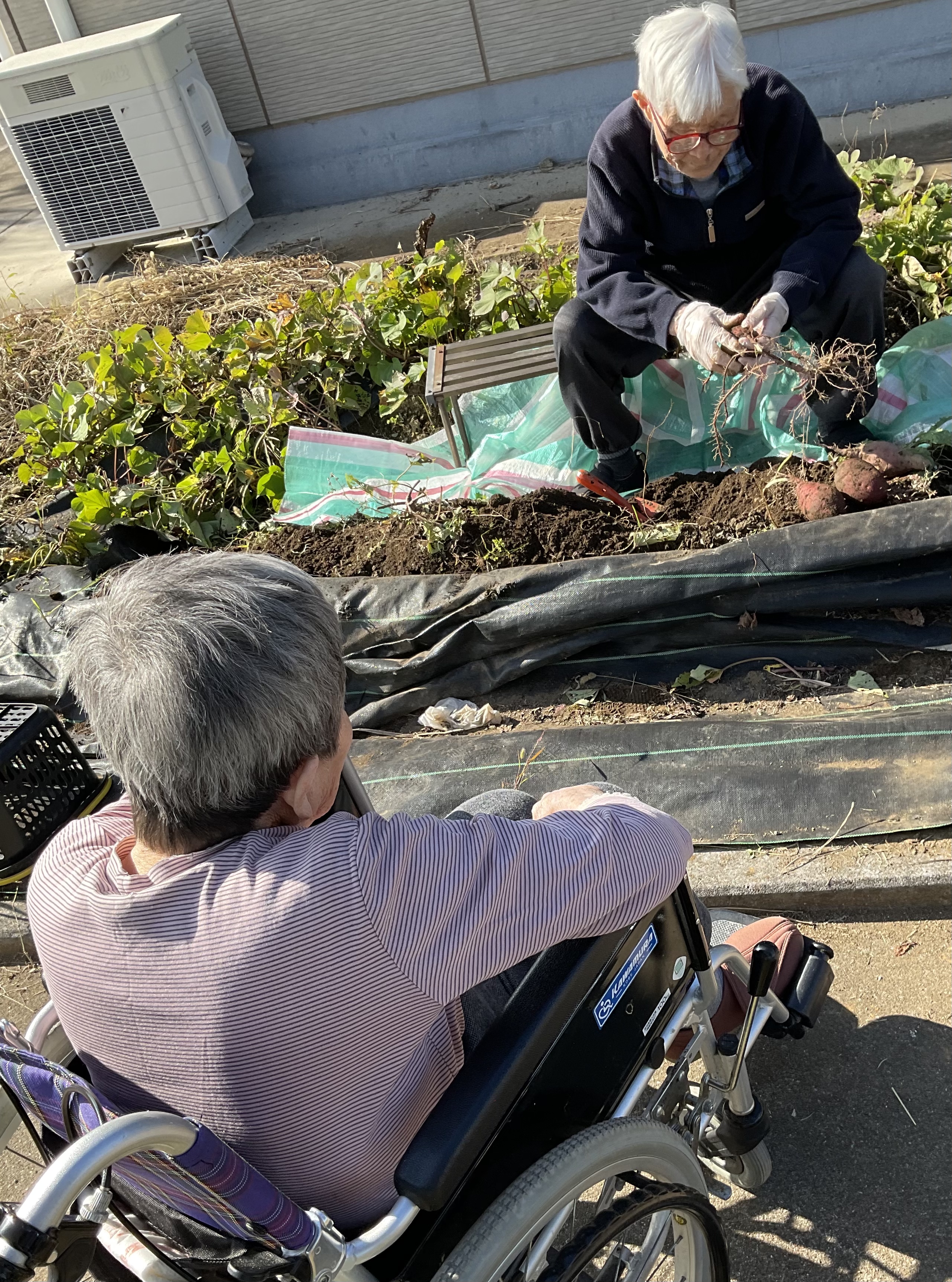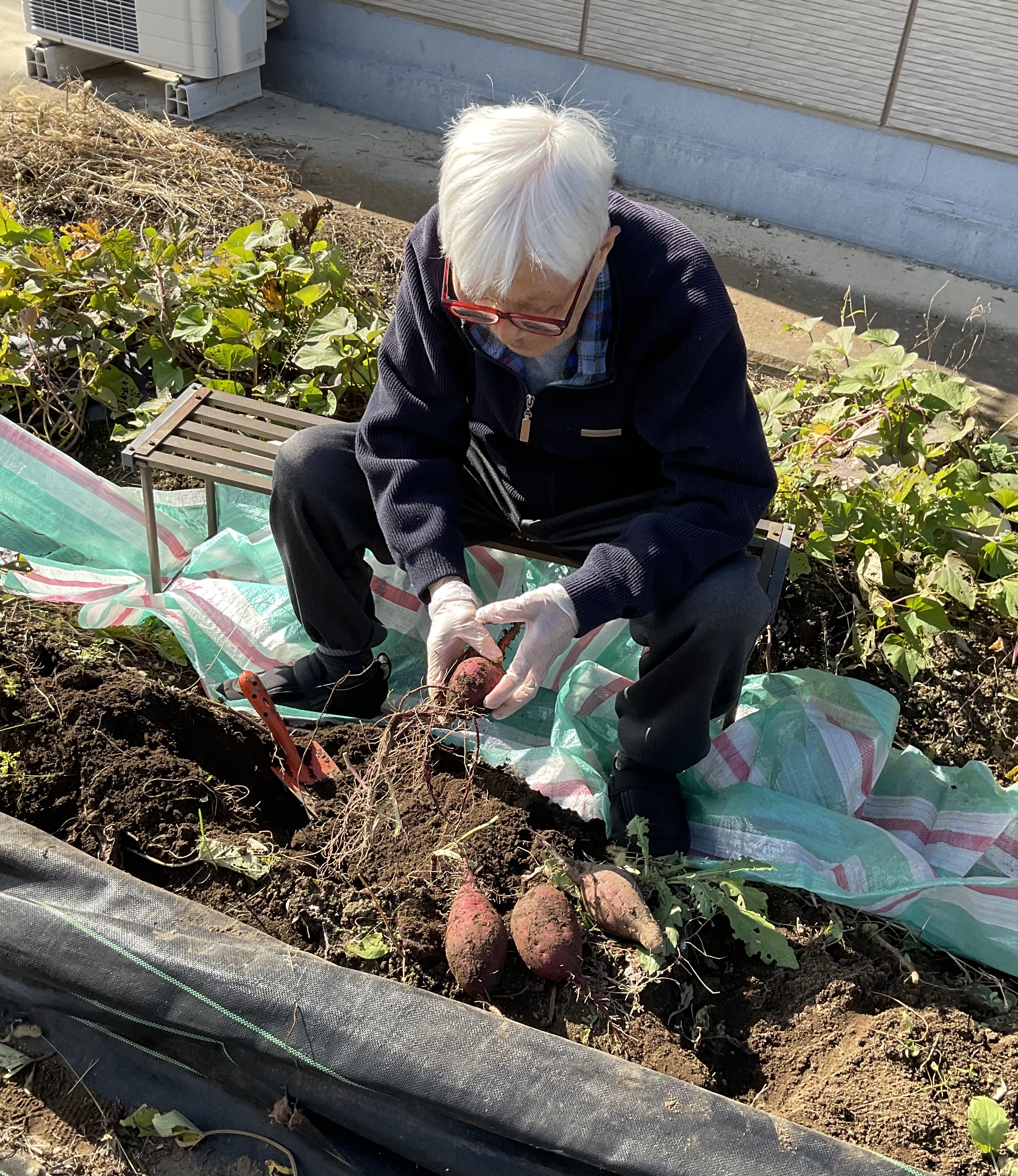 今日も秋晴れ!お芋掘り日和。力強くお芋を掘っていただこうと思っていましたが、皆さん遠慮がち。なんだかちょっぴり体力の衰えを感じていらっしゃるのでした。去年までは、四つん這いになって頑張って掘っていらっしゃたのに。無理はしないで、掘れる方に頑張っていただきました。収穫の程はまあまあ。明日のおやつと来月のお昼のおかずの材料になります。楽しみです。(板)
