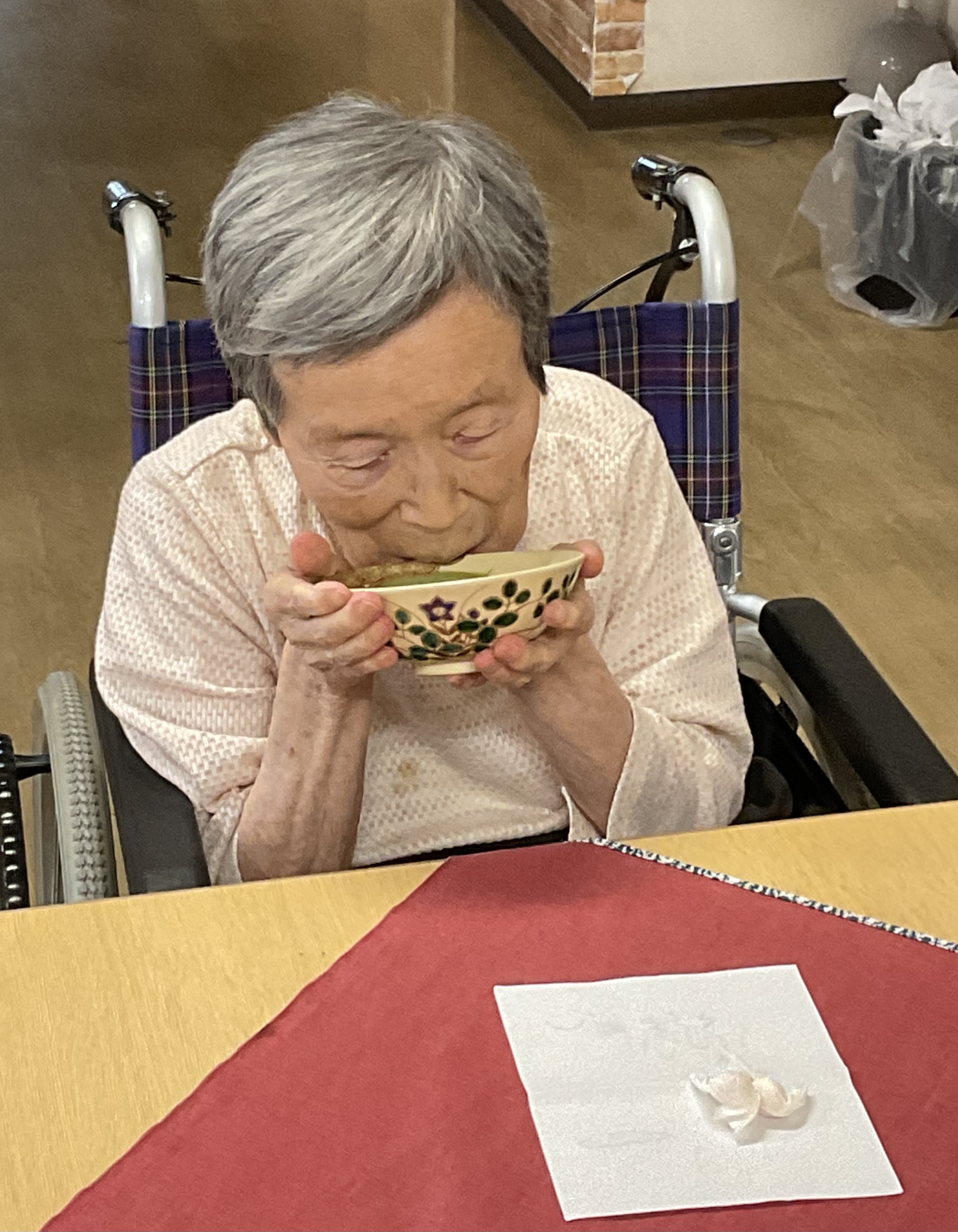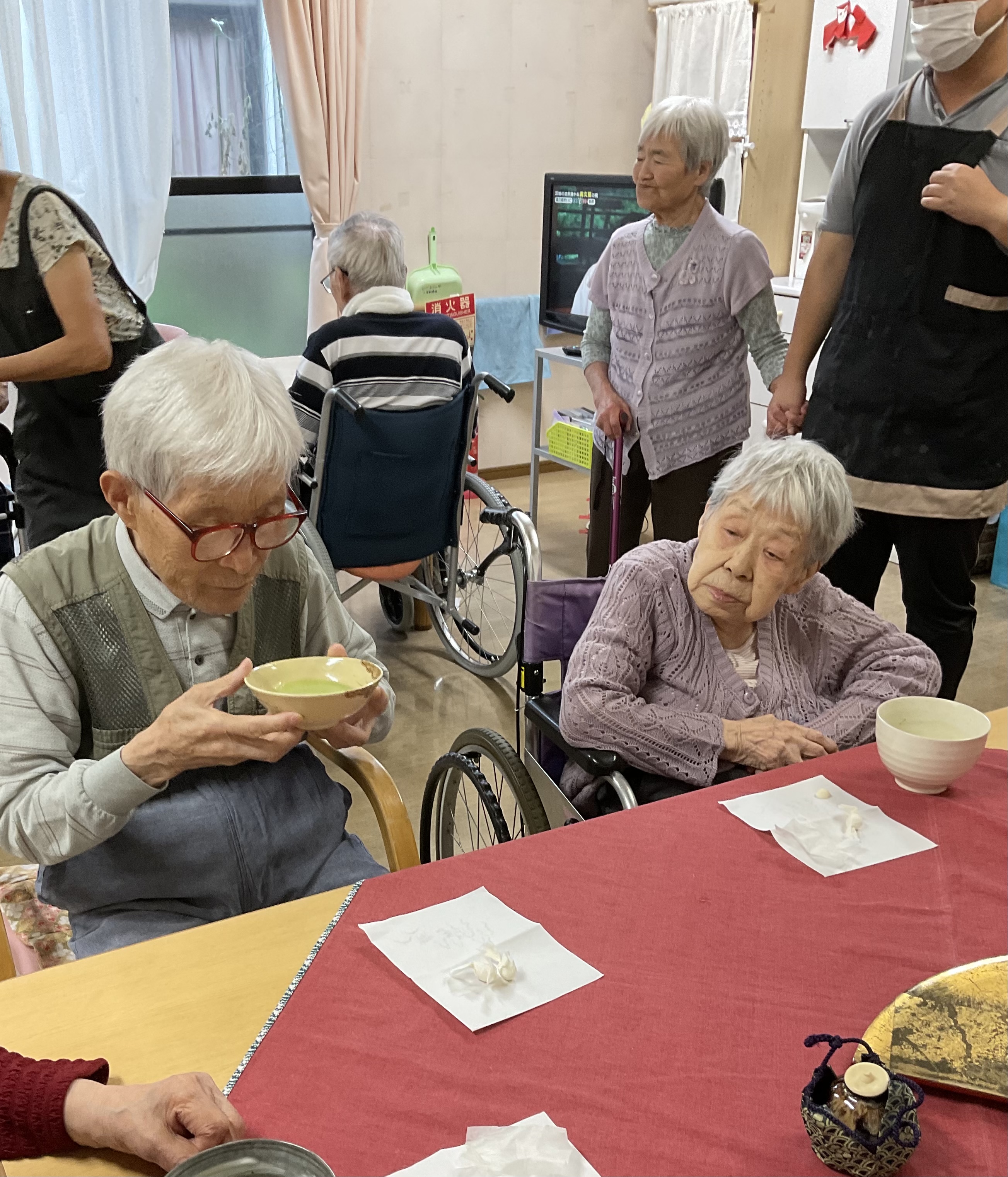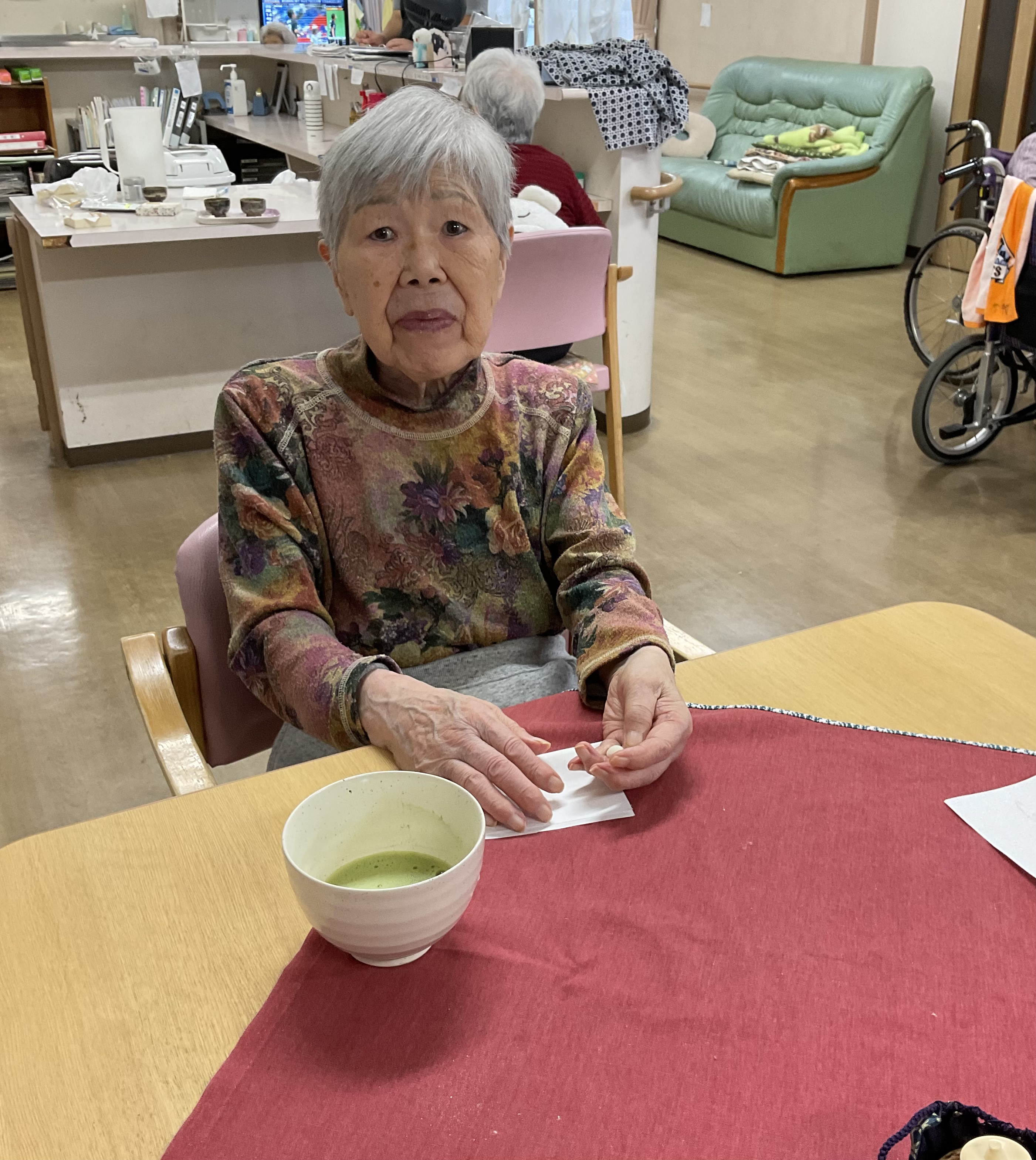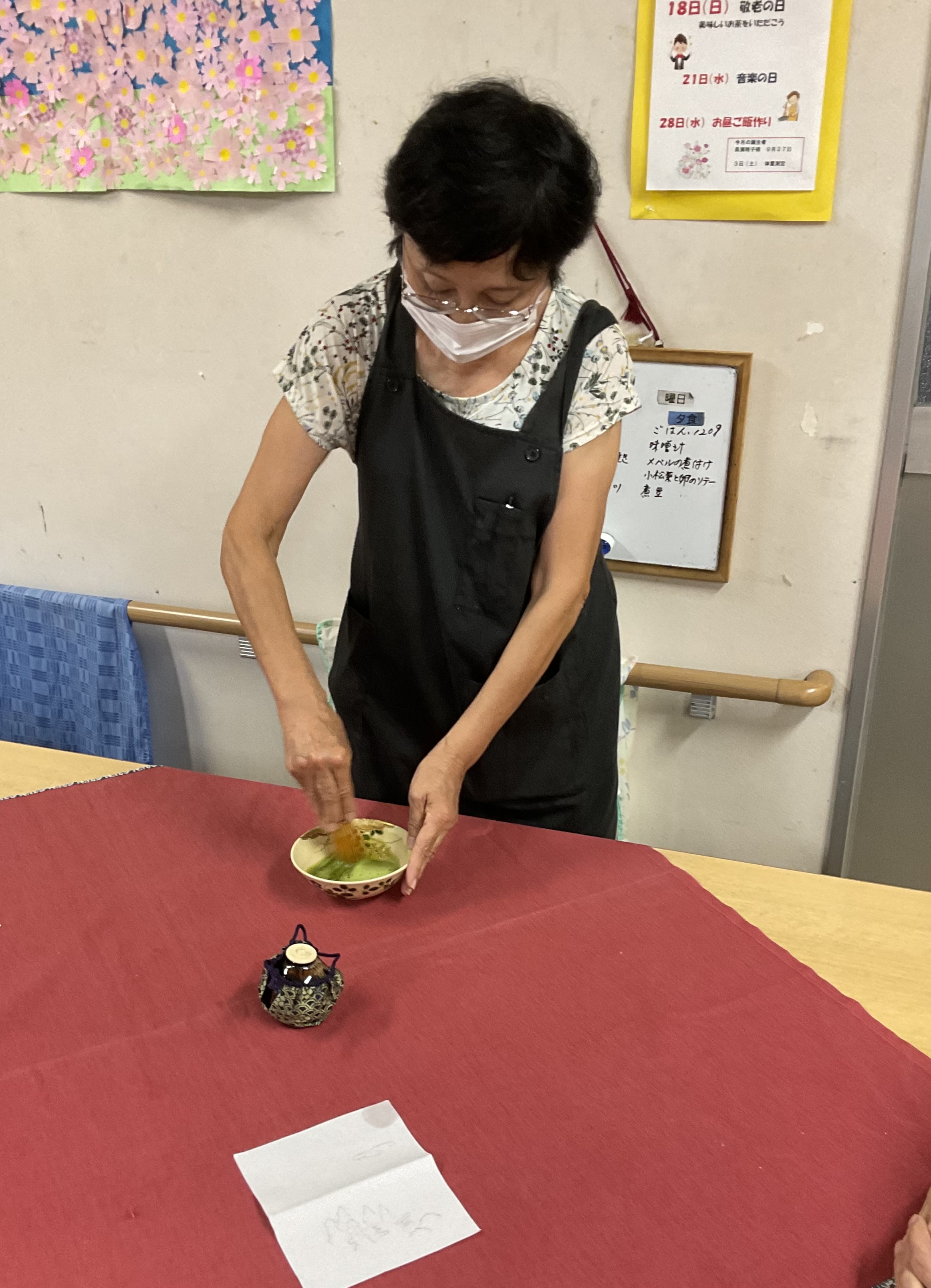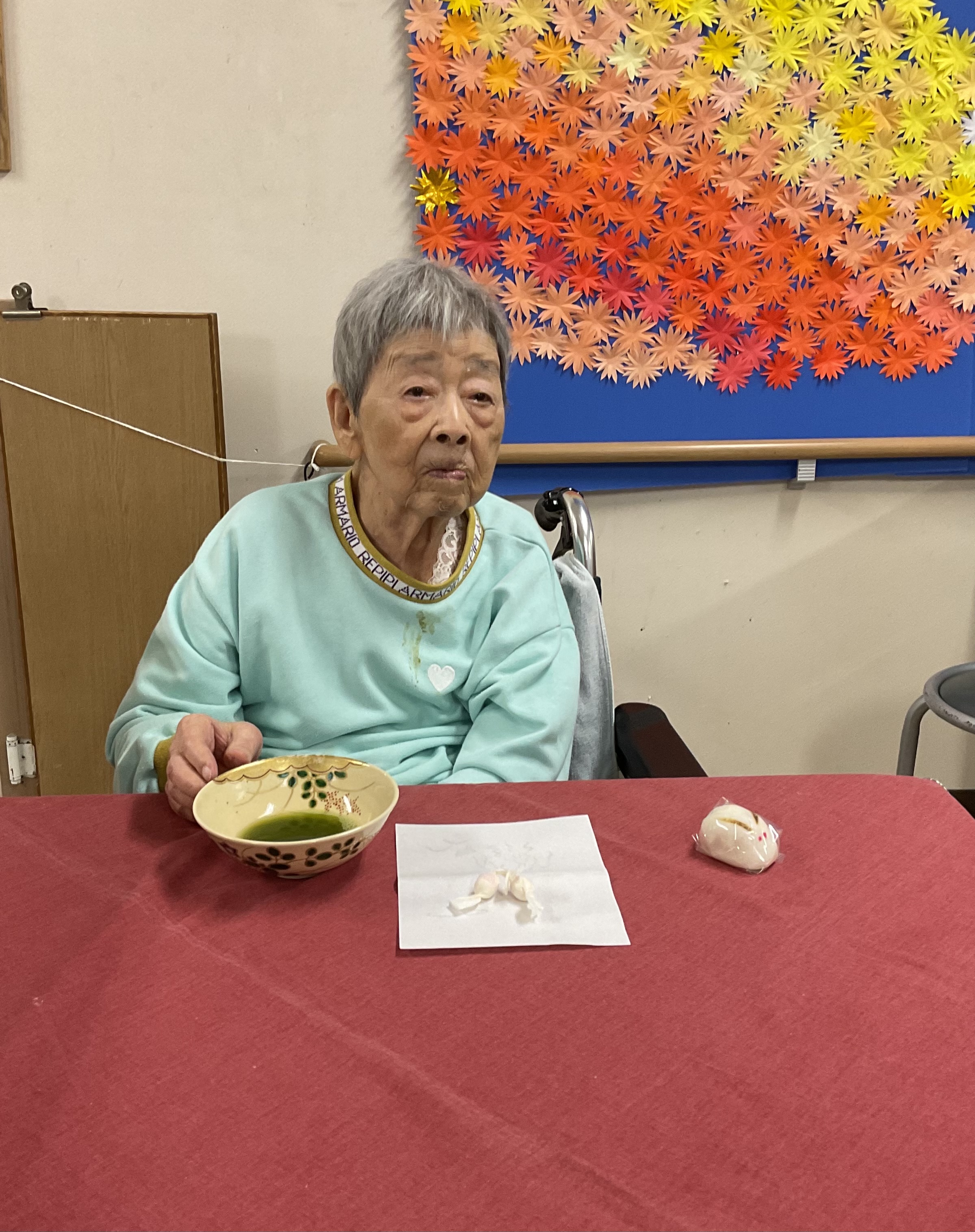 『結構なお点前でした。』なんて言っていただきながら、お抹茶を飲んでいただきました。茶の湯の碗を持たれる姿は気品に満ちあふれていらっしゃいましたよ。ご利用者の皆さまは、今年も大変お元気で敬老の日を迎えられました。(板)