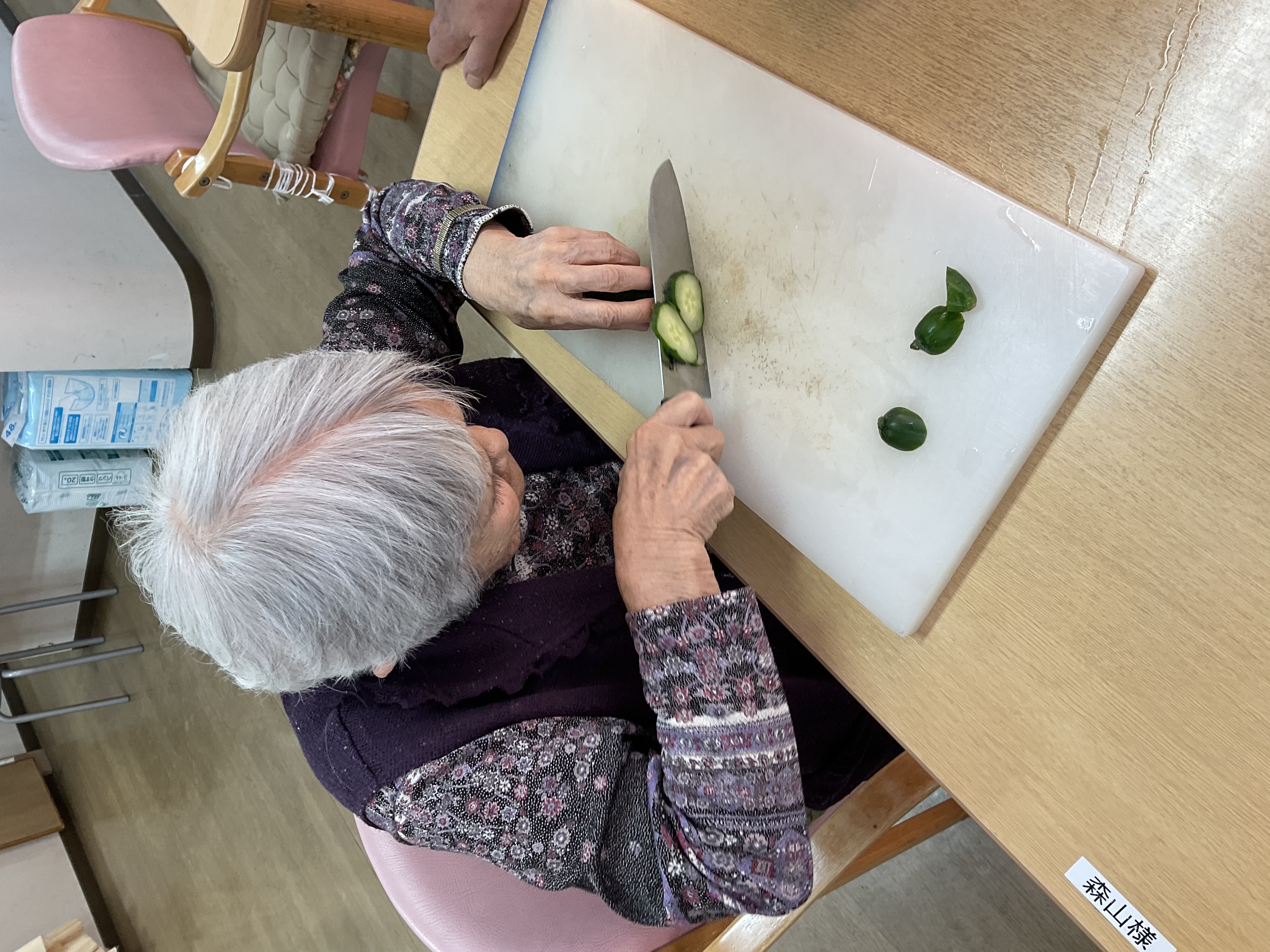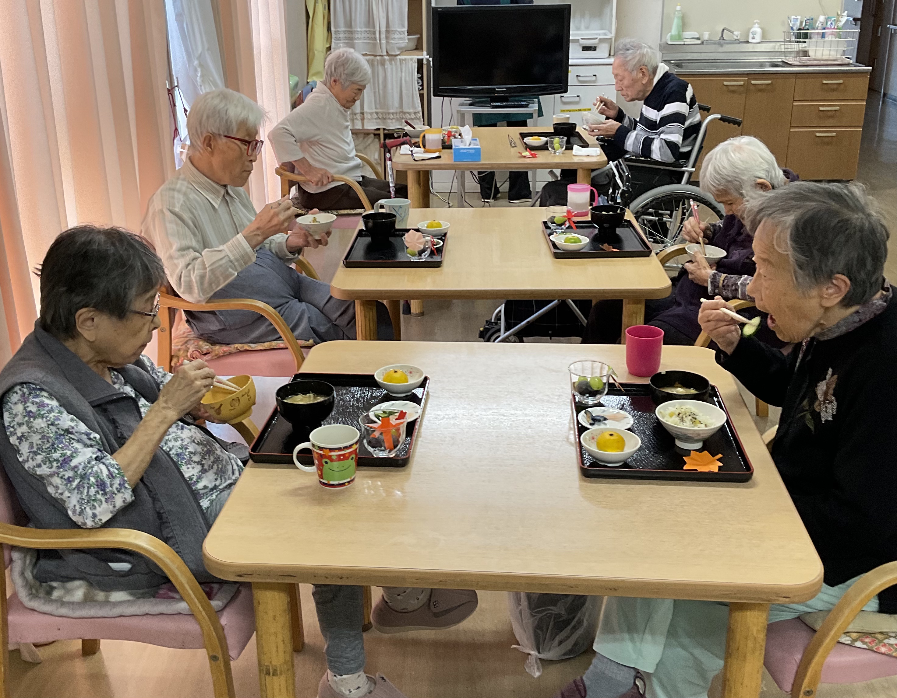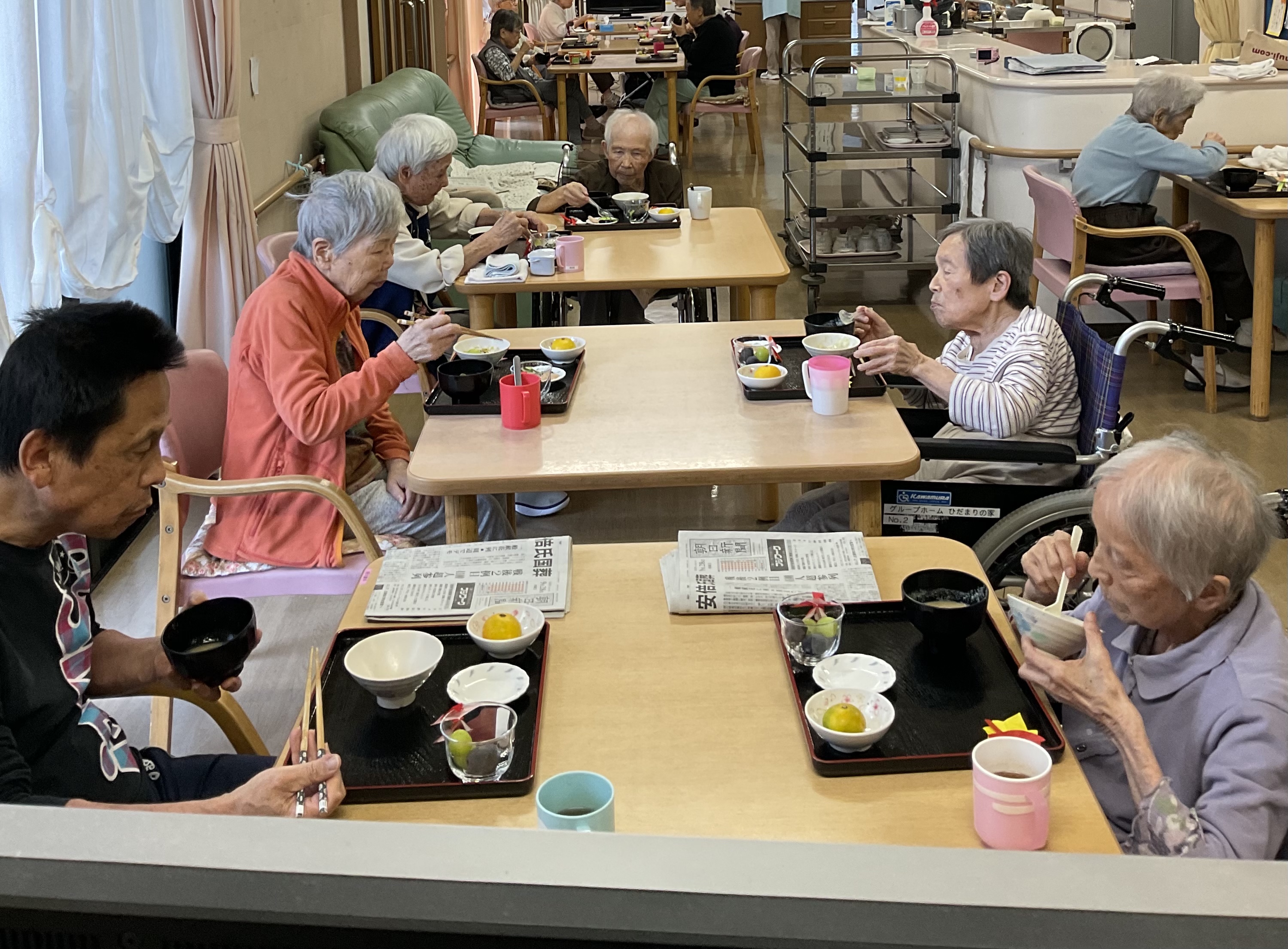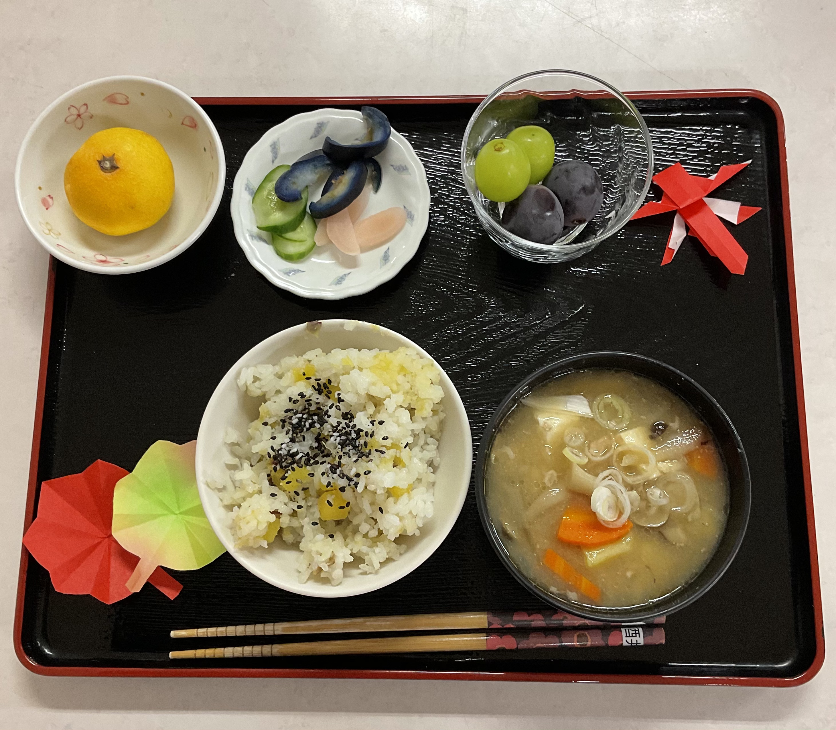 今日は、いきなりドンと大揺れの地震が来てビックリしましたよね。被害はありませんでしたが、地震はこわいですね。さて、先日28日は、お昼ご飯作りでした。お芋の沢山入った豚汁とお芋のたっぷり入ったお芋ご飯をつくりました。デザートには、シャインマスカットとみかん。もう少しシャインマスカットが欲しいところでしたが、ご利用者の皆さまのお腹は、充分に満足されたようでした。