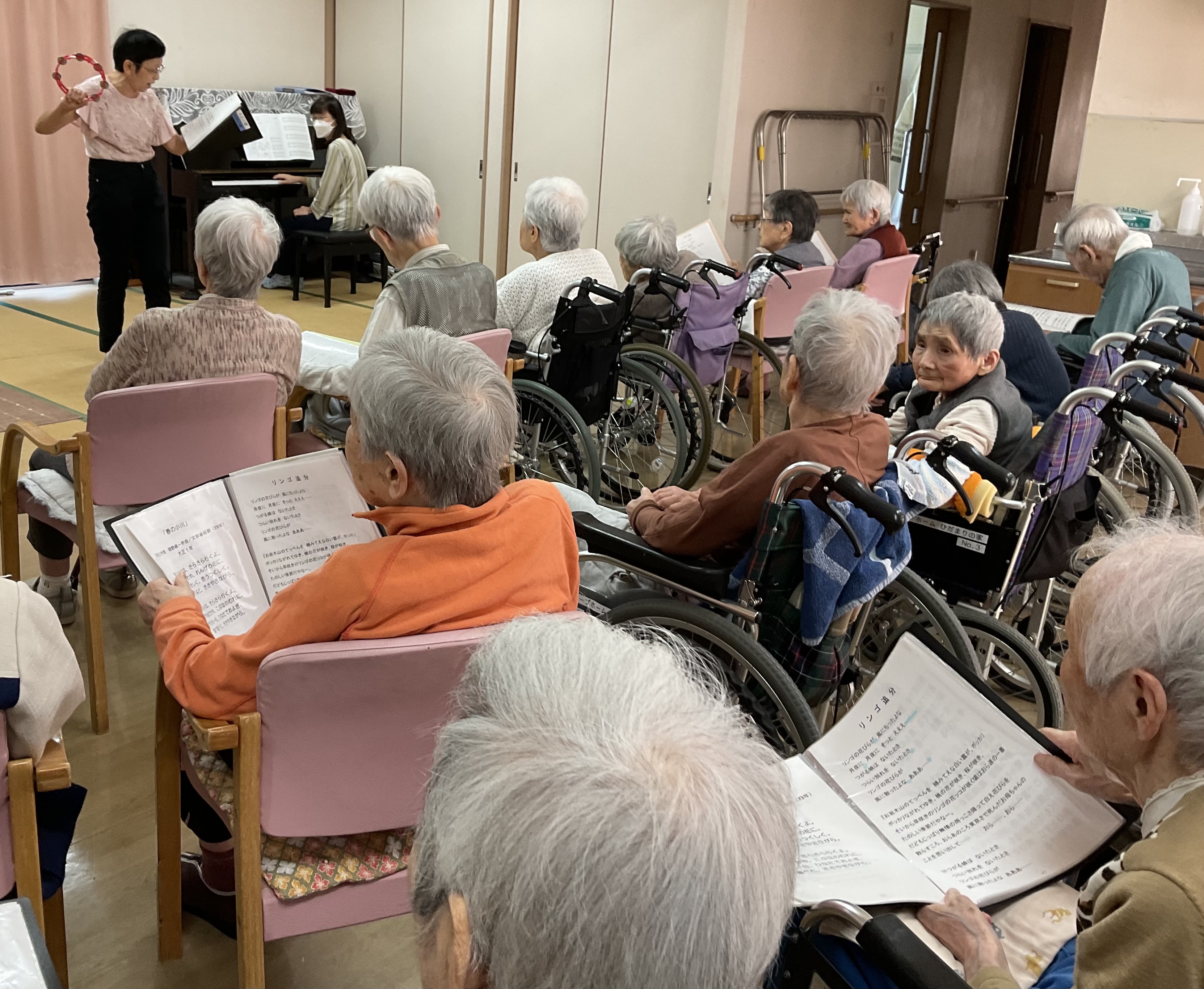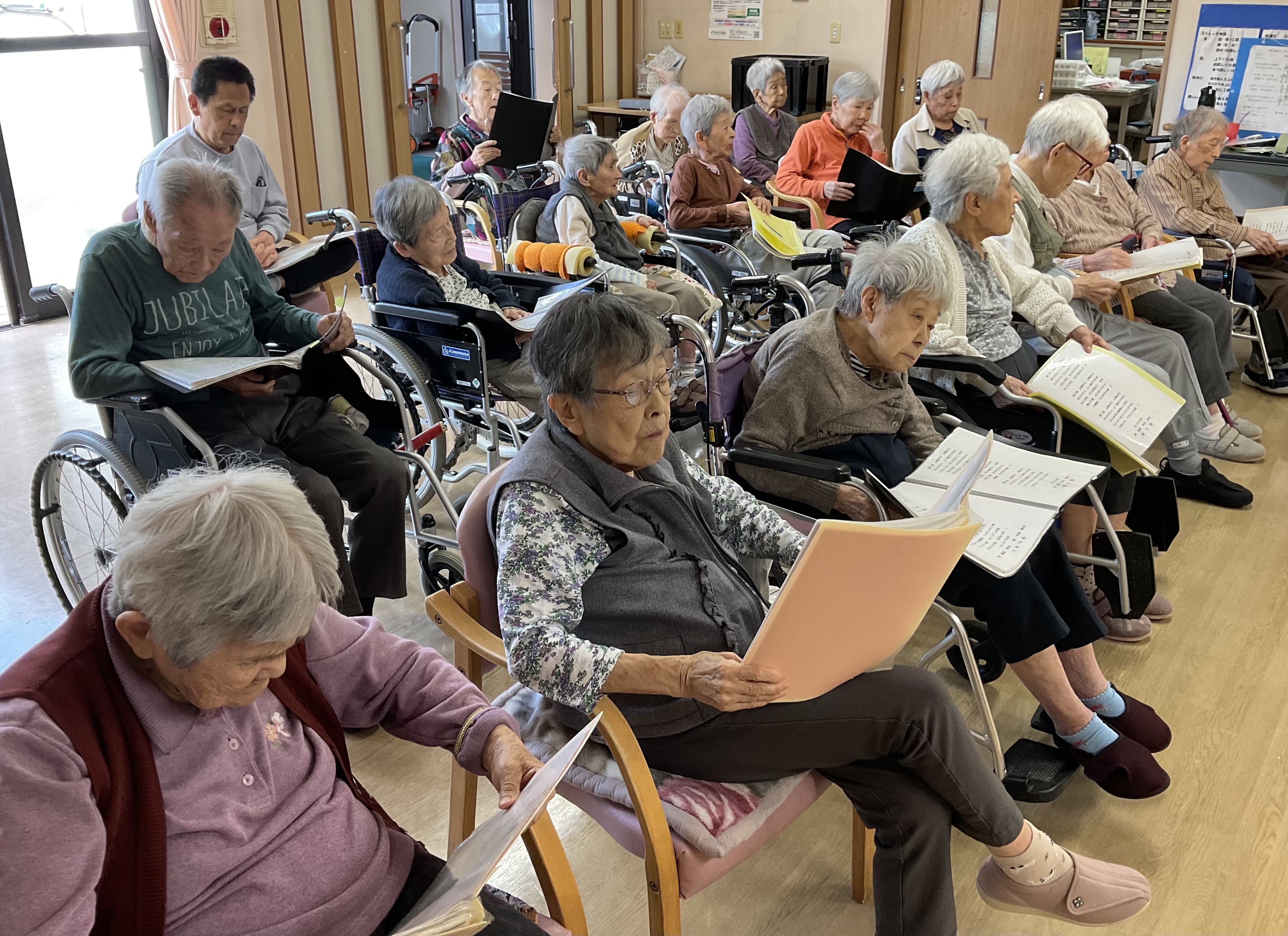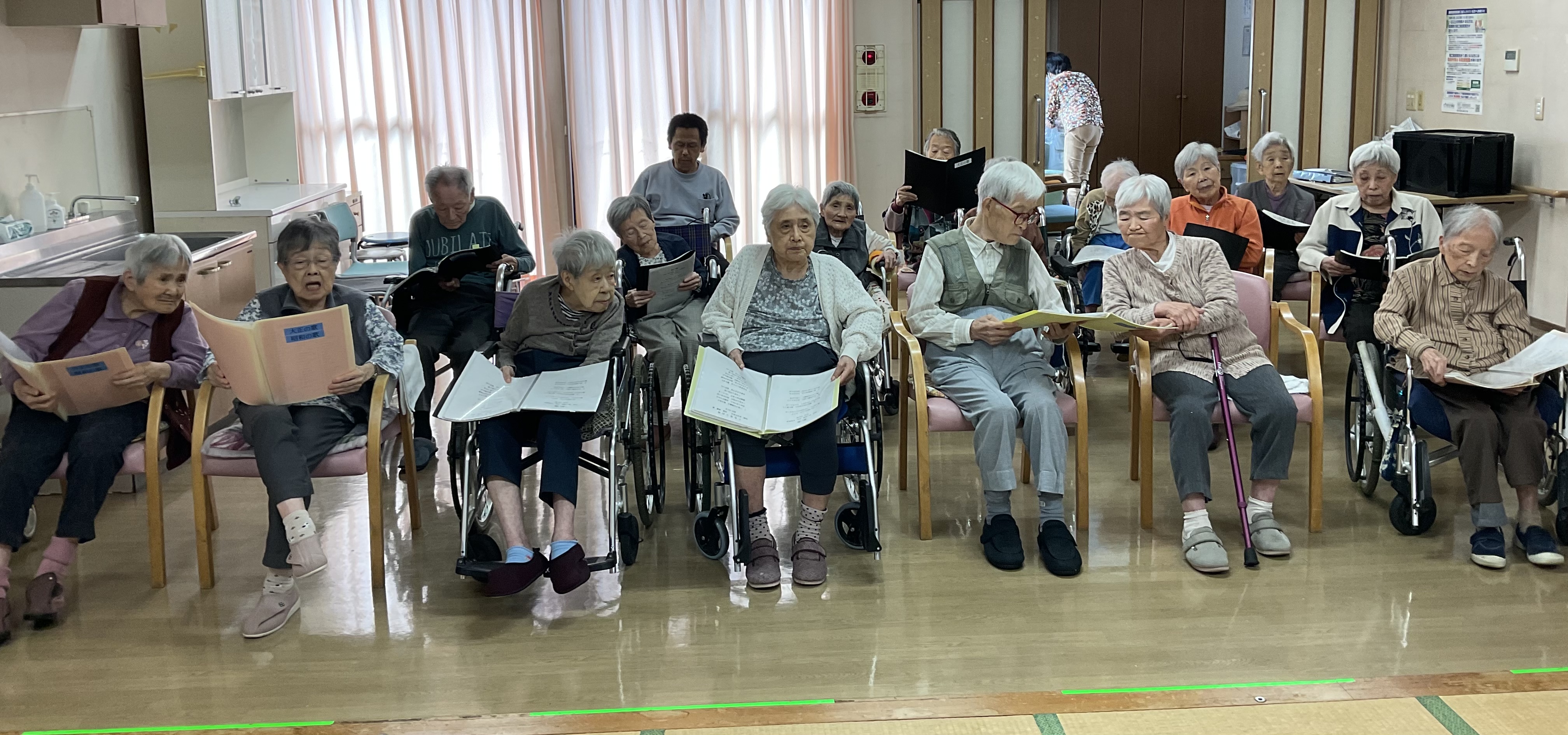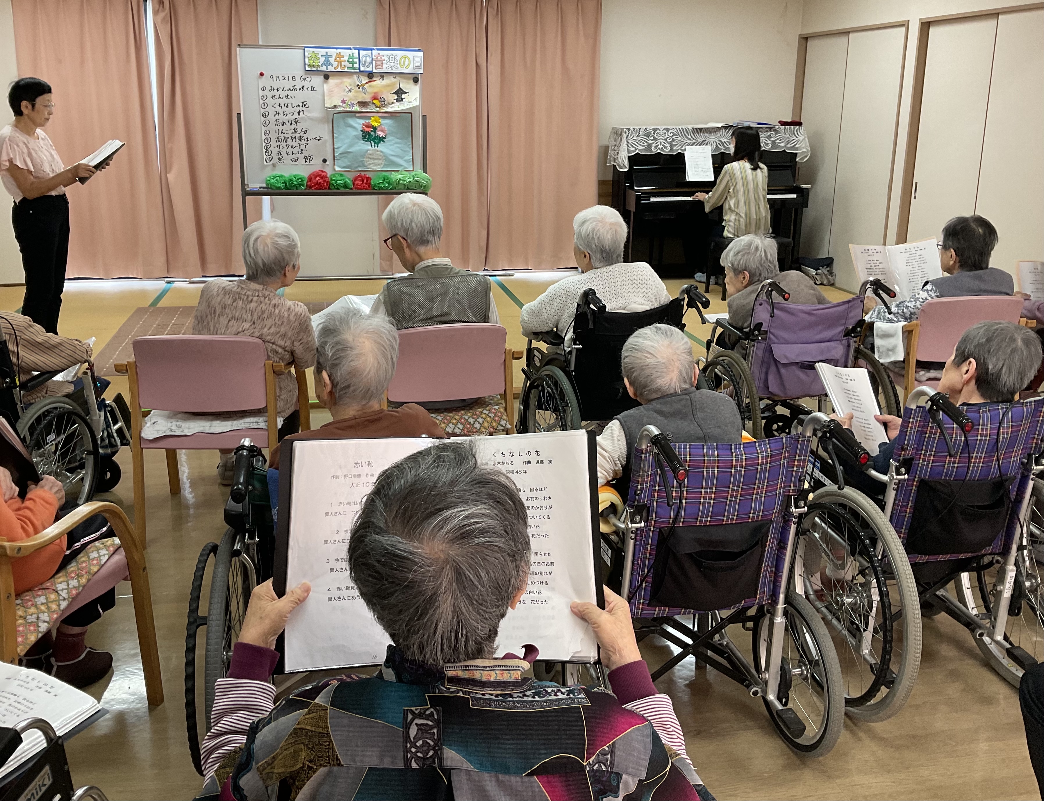 コロナ感染の広がりに、お休みにしていた音楽の日。何とか再開出来ました。ピアノの先生によるショパンの幻想即興曲に始まり、いつものように、担当の職員のリードで馴染みの昭和の歌を沢山歌うことが出来ました。今回は、黒田節の舞踊を覚えようということになり、扇子やうちわを持ってチャレンジしました。黒田節をうまく踊れるようになりご披露できるようになれたらと思います。(板)