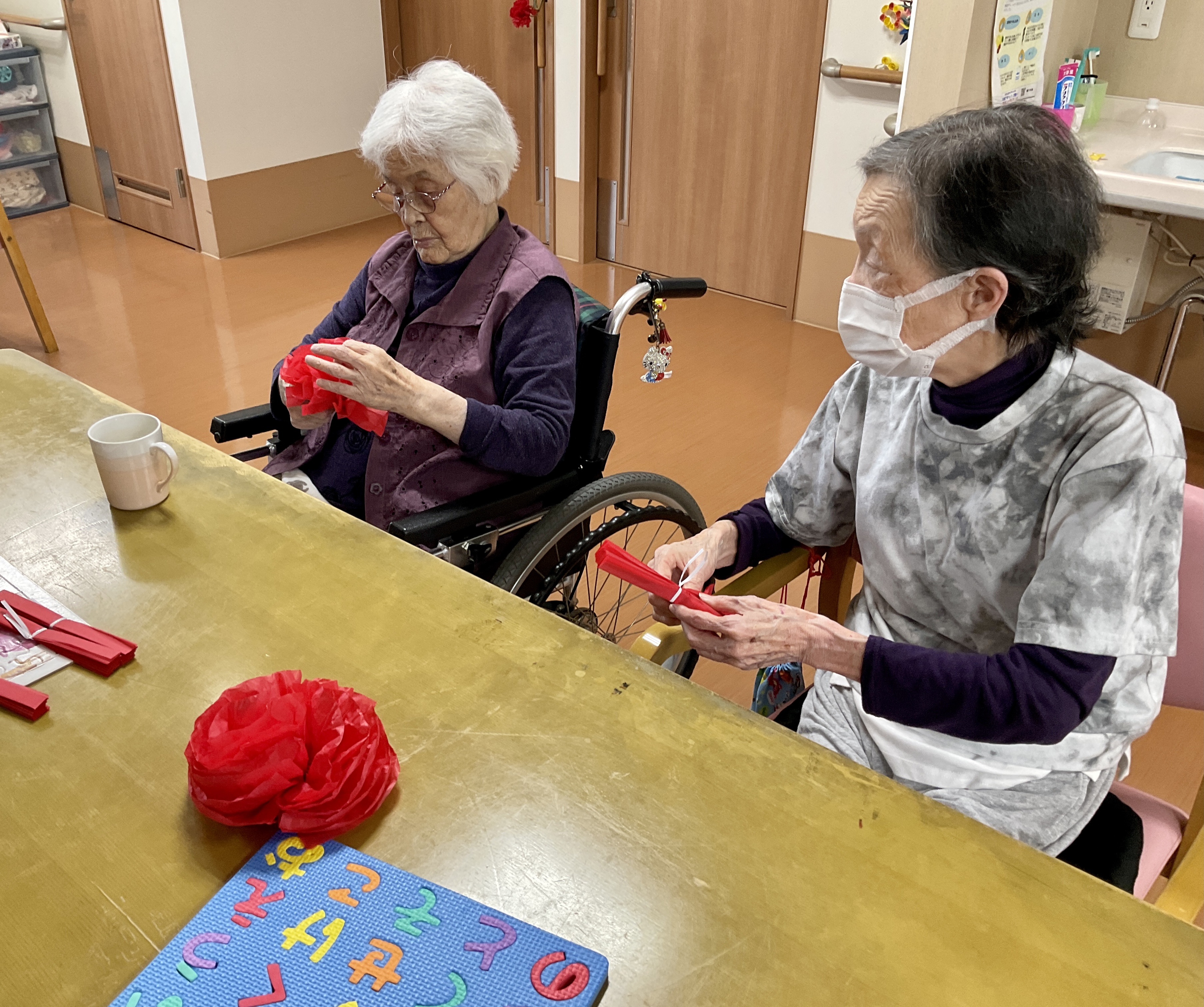 明日の納涼祭に向けて、ヨーヨー作りやお花作りをしています