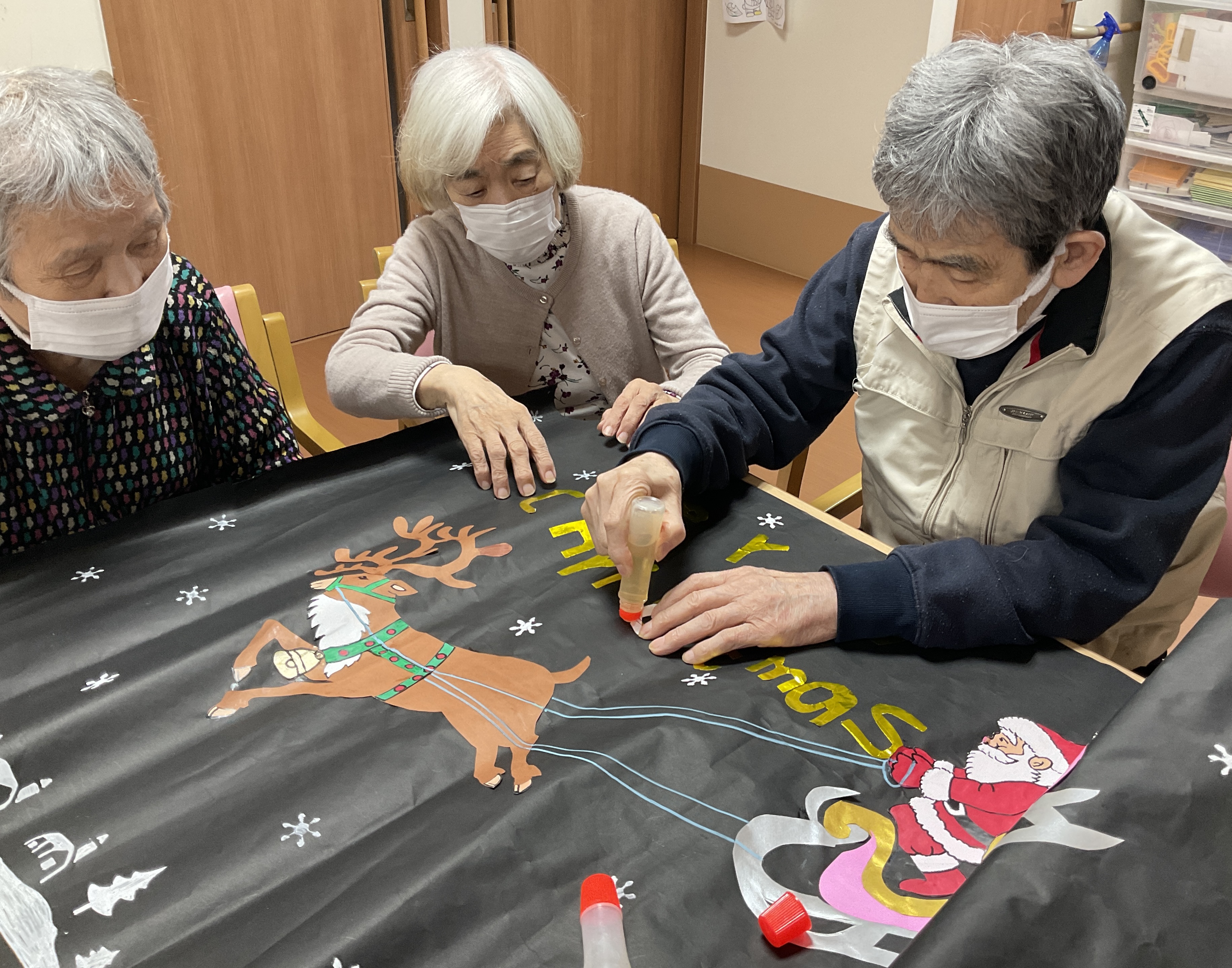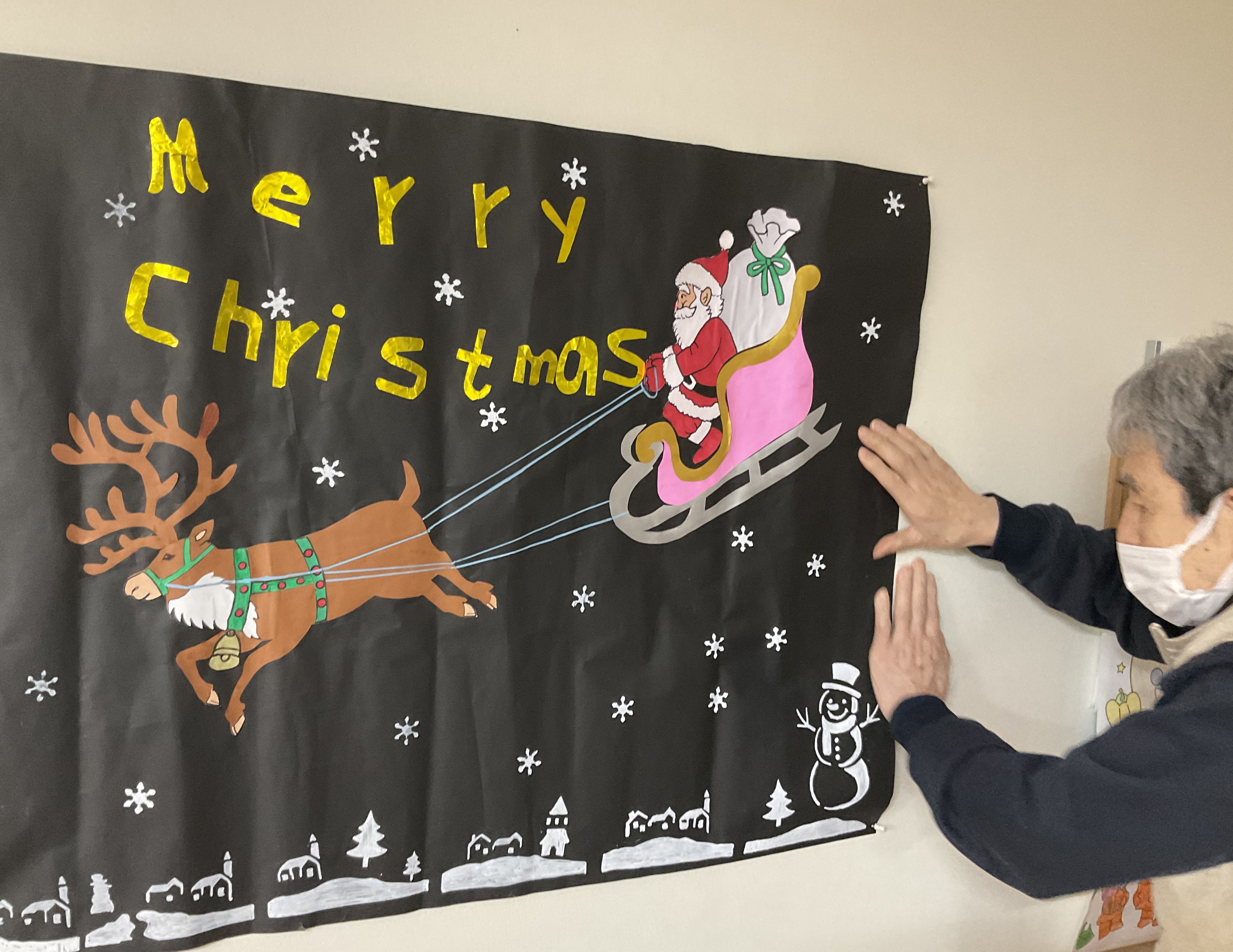 クリスマスへ向けてクリスマスツリーを飾り、壁画作りをしました