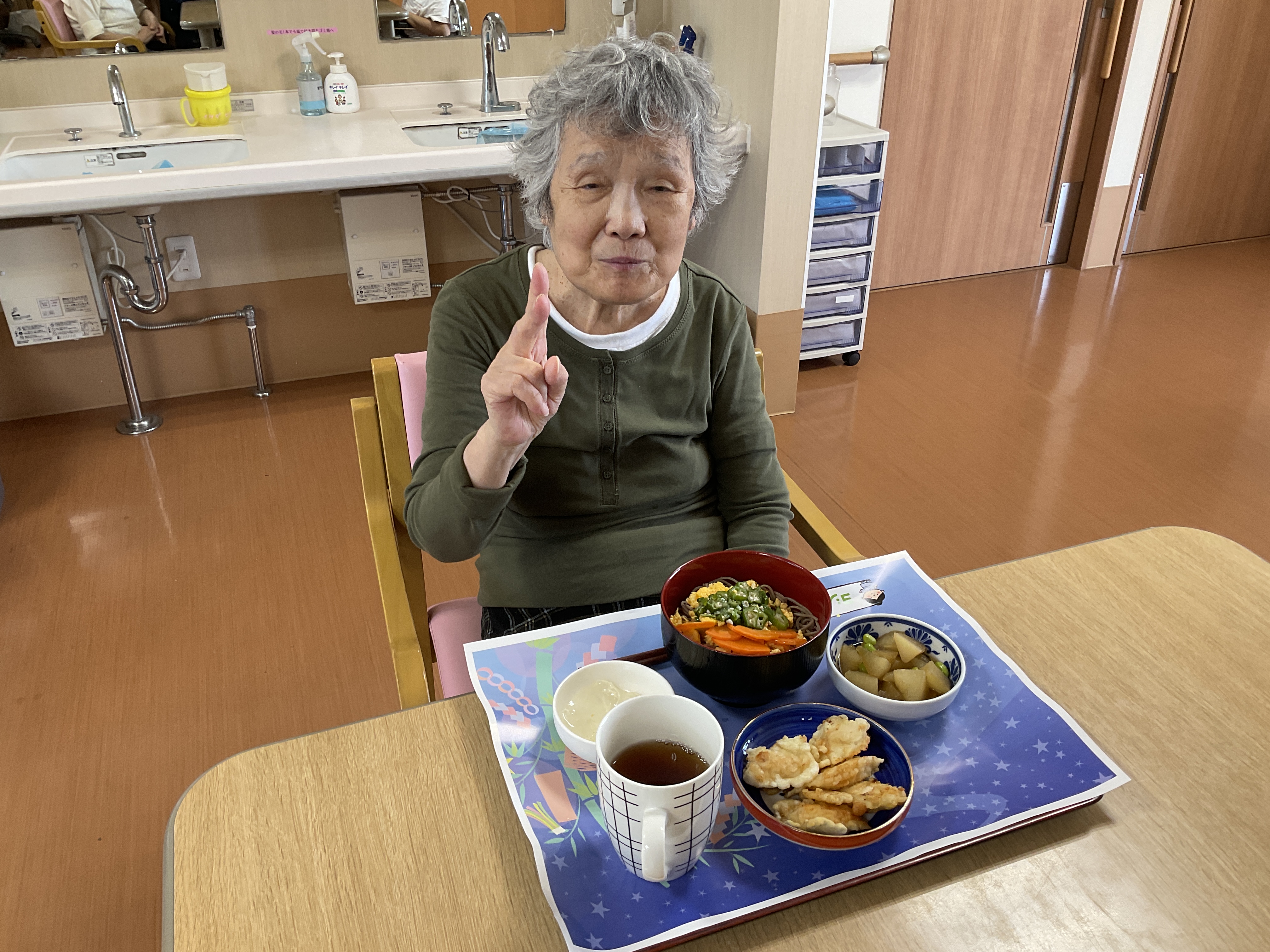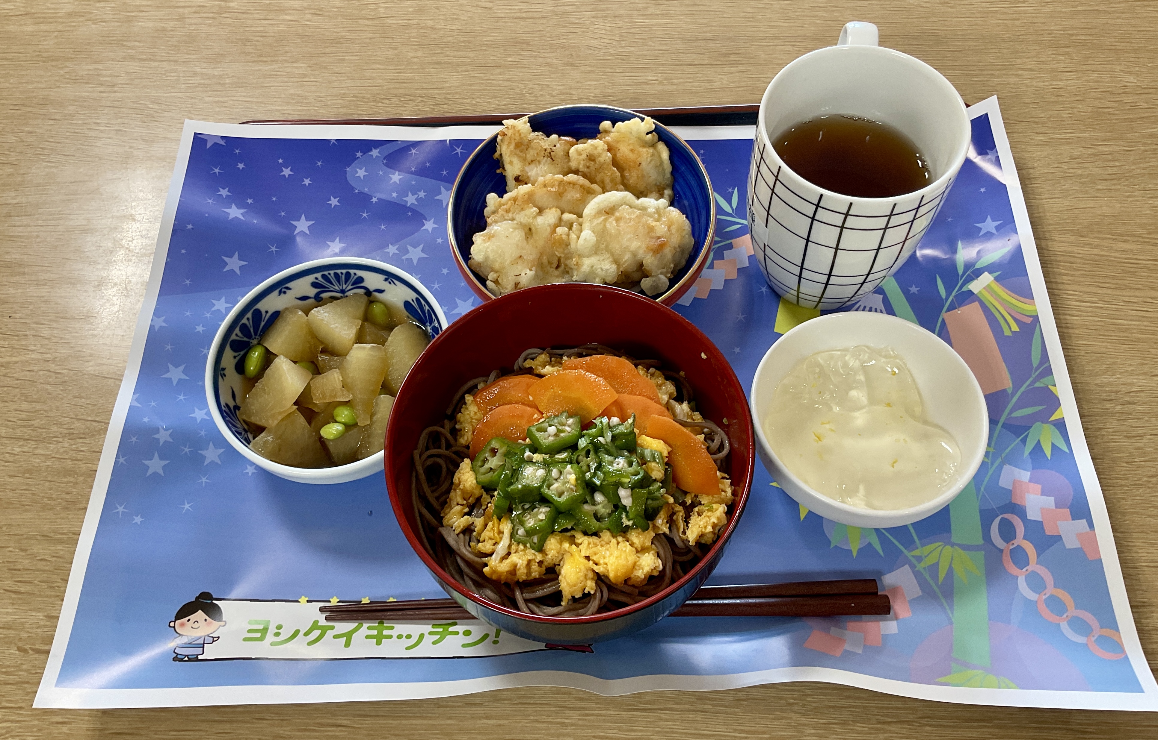 お昼は七夕ぶっかけとろろそば、かしわ天、大根煮物、ゆずゼリーでした⭐️