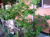 施設玄関脇のブルーベリーの木。5月から成長を追っていますが、やっと実が色づきはじめました。