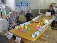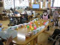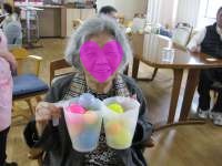 今日のレクは大小様々なボールを落とし、利用者様が持たれているピッチャーの中に、できるだけ多くのボールを入れる事ができるかを競うゲームです。