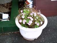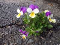アスファルトにも負けず、隙間から力強く花を咲かせたビオラ。