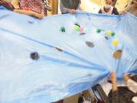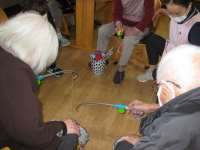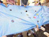 今日のレクリエーションは穴の開いたブルーシートにボールを落とすゲームです。