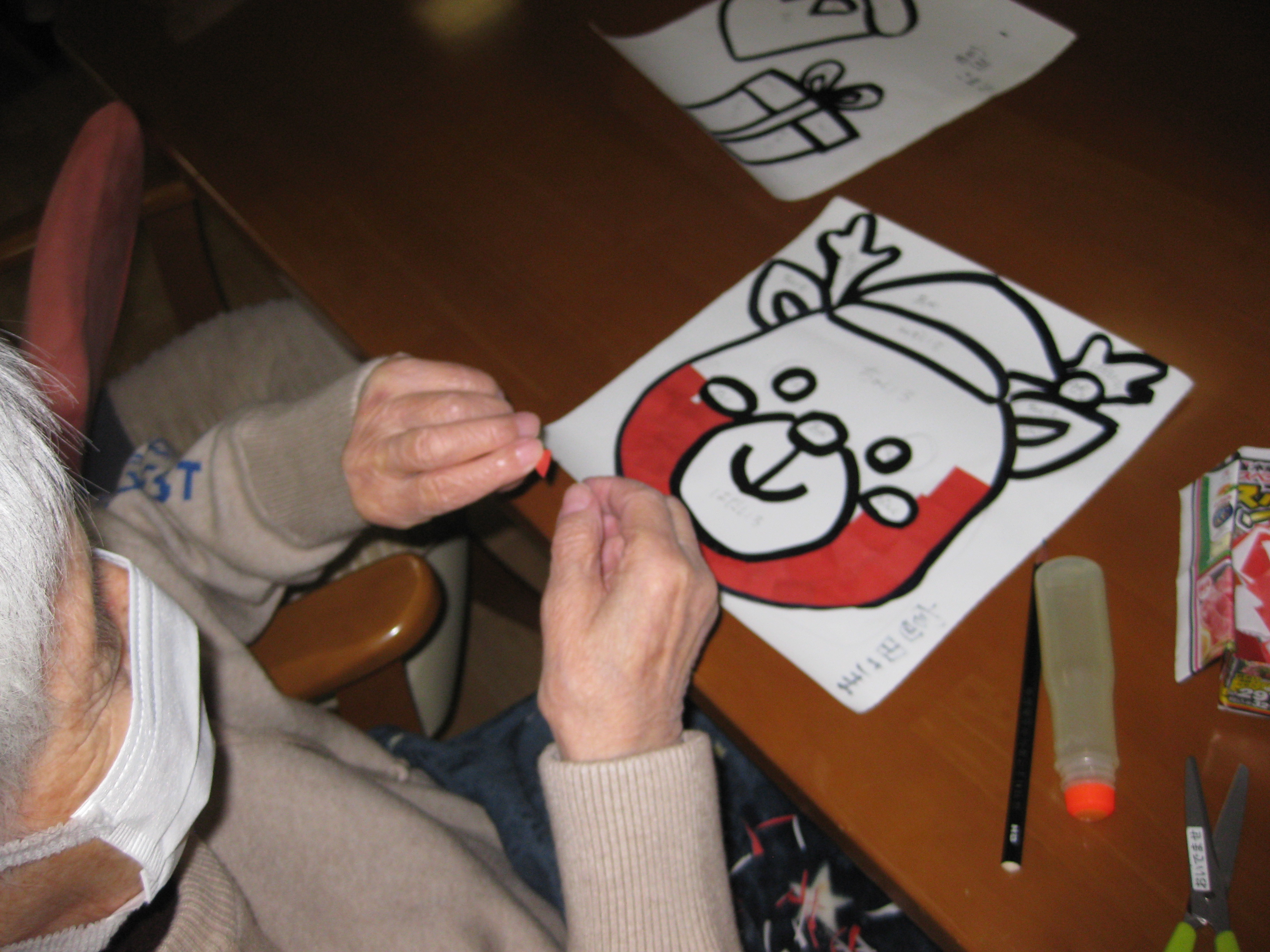 玄関前の巨大看板はイラストの得意な看護師が担当していますが、室内の貼り絵を担当した職員はイラストがやや苦手な分野となりトナカイを描くも「くま?」と自問自答しつつ貼り絵上手な利用者様の手でしっかりトナカイになる事を願っています(笑)