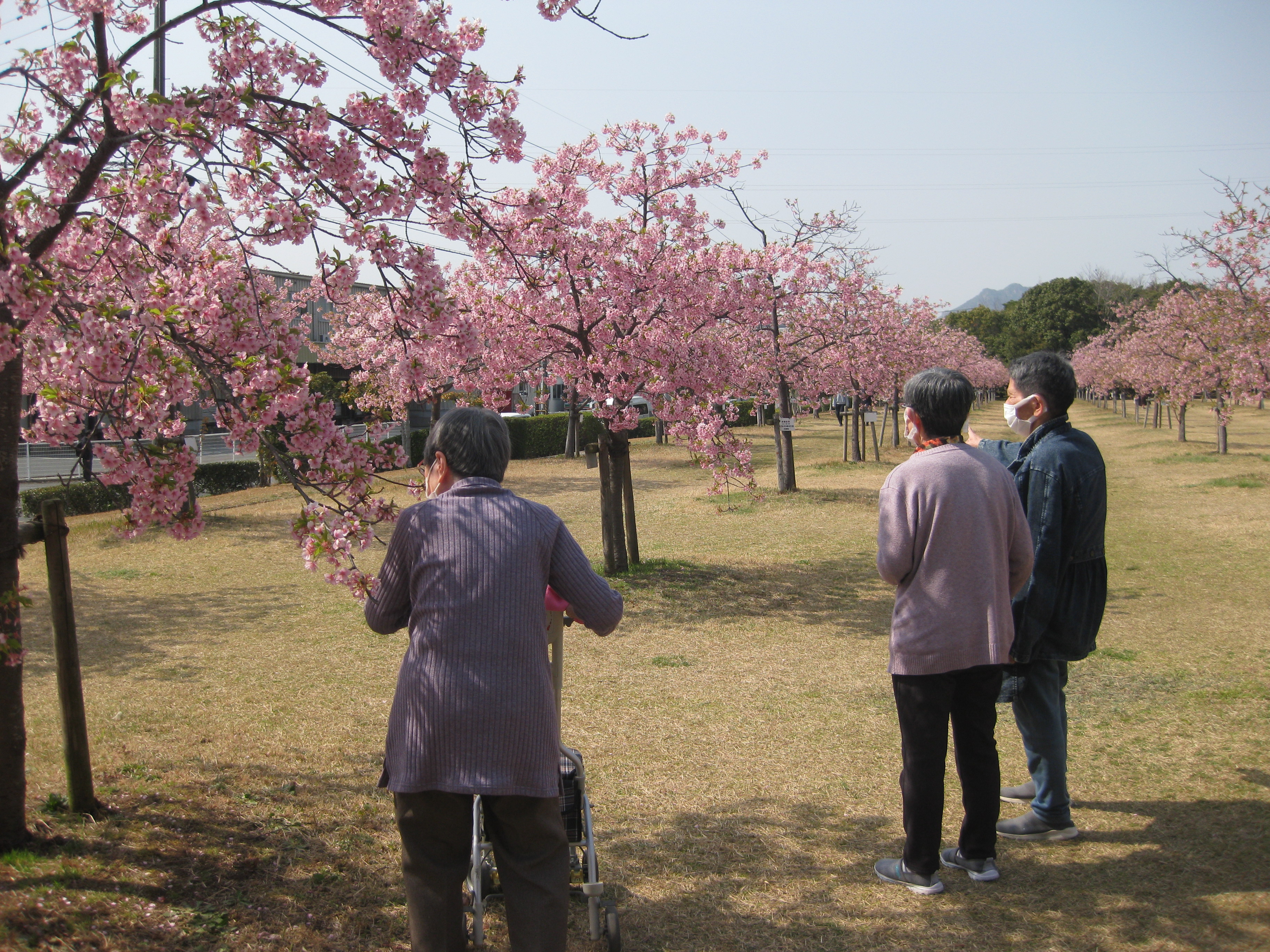 ご利用者と近くの公園にお花見に行ってきました。天気も良くとても暖かく、河津桜も満開となっておりとても奇麗でした😀