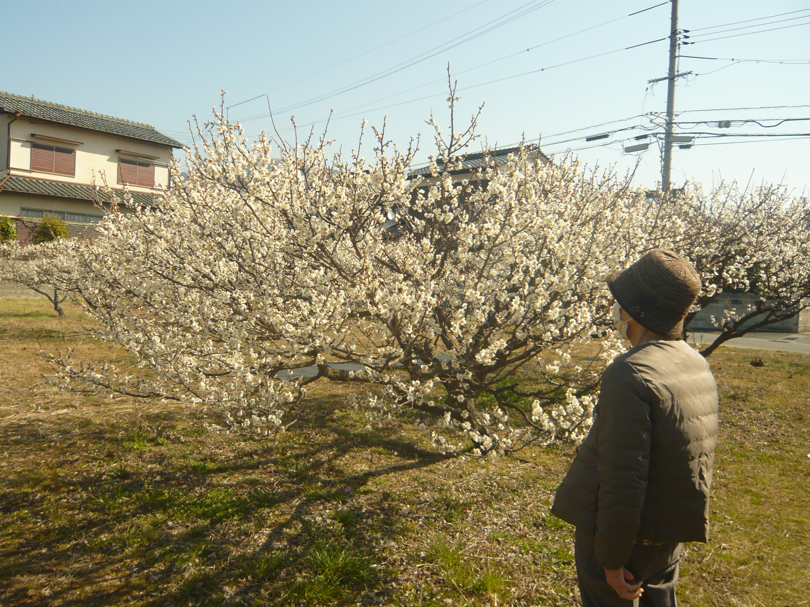 今回寒桜が蕾だった為、施設近くの梅を利用者様と一緒に見に行ってきました。