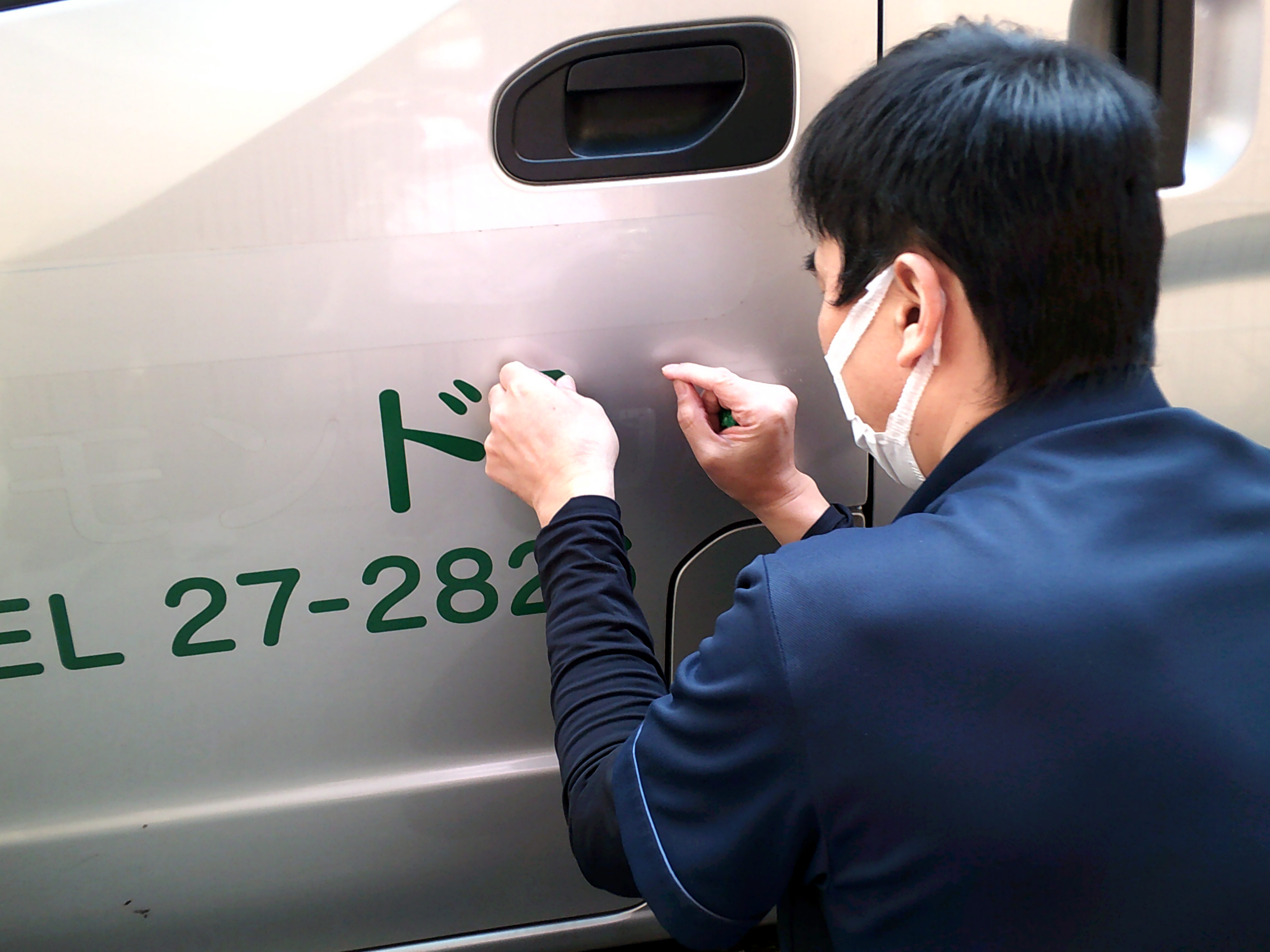 社用車に新しい名称を施行してもらう為、朝の業務前時間を使い古い名称を剥がす作業をしました。