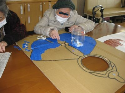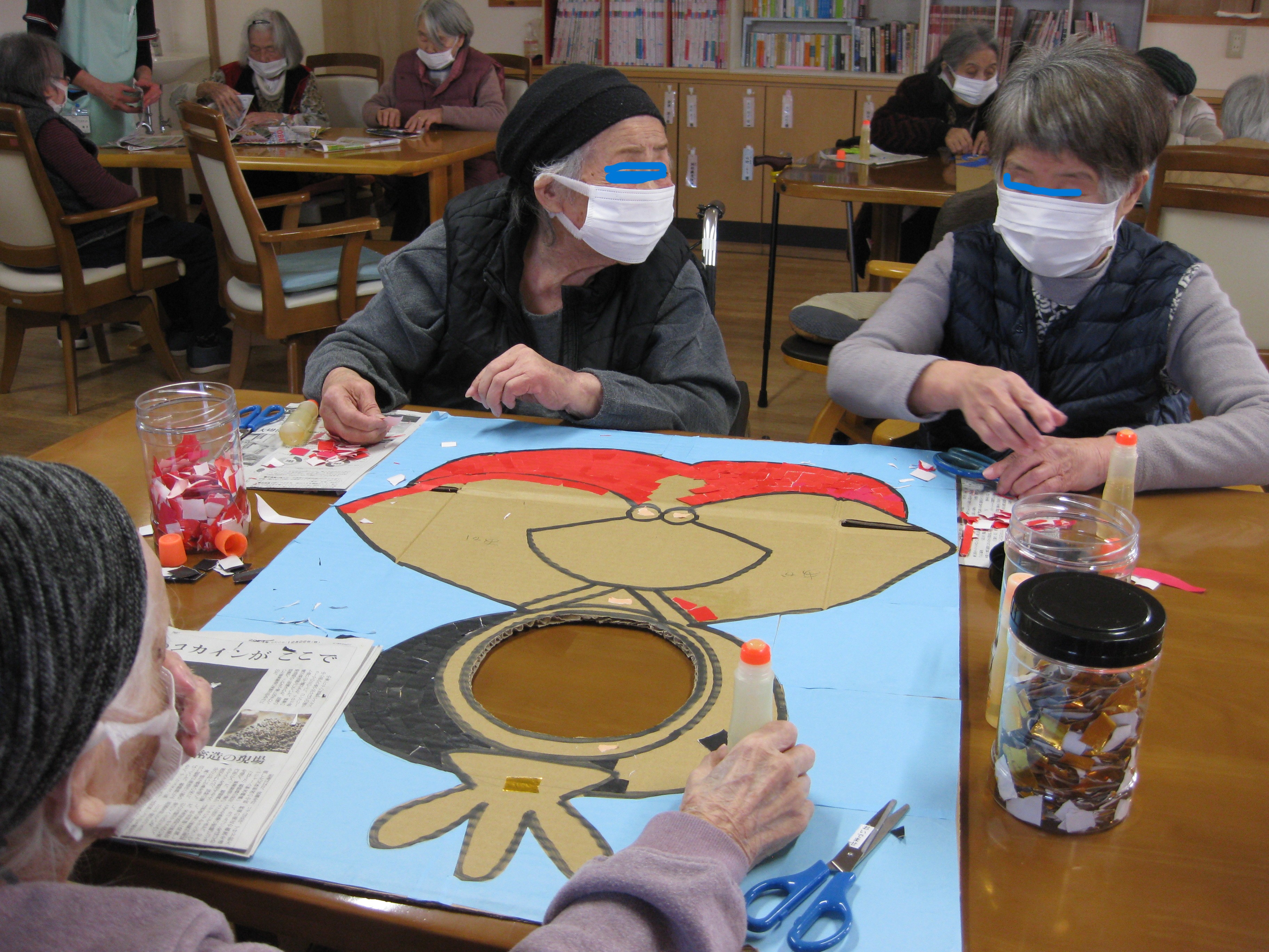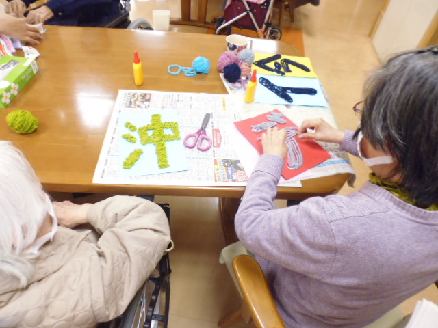 編んでもらった毛糸紐で”沖今宿デイサービス”の文字を作っている途中です。もう直ぐ、完成です👍