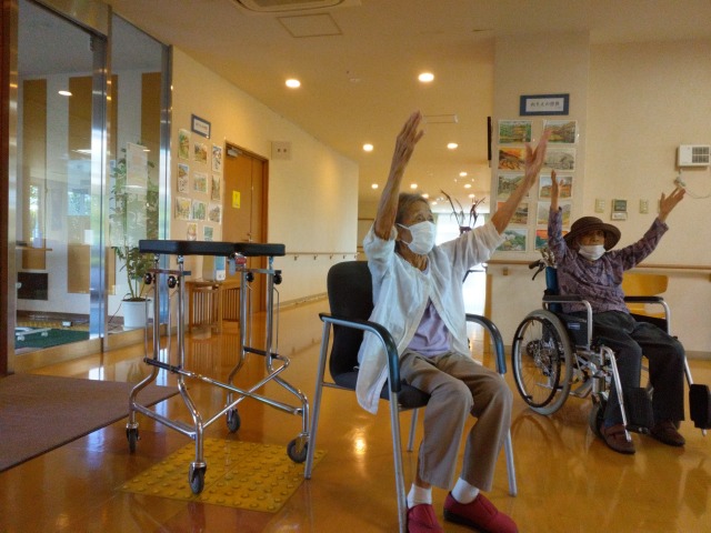 本日は5名の入居者様がラジオ体操にお越しいただけました☆彡皆様お変わりなく、お元気にラジオ体操に取組んでおられました\(^o^)/