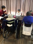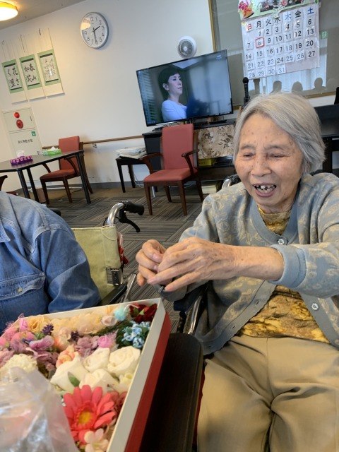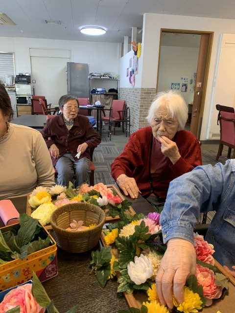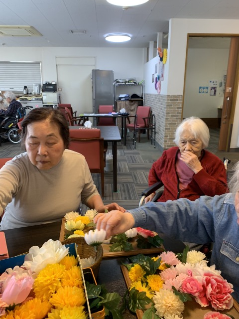 ご入居者様同士で賑やか、にぎやか・・・お花を探すために椅子の立ちすわりを