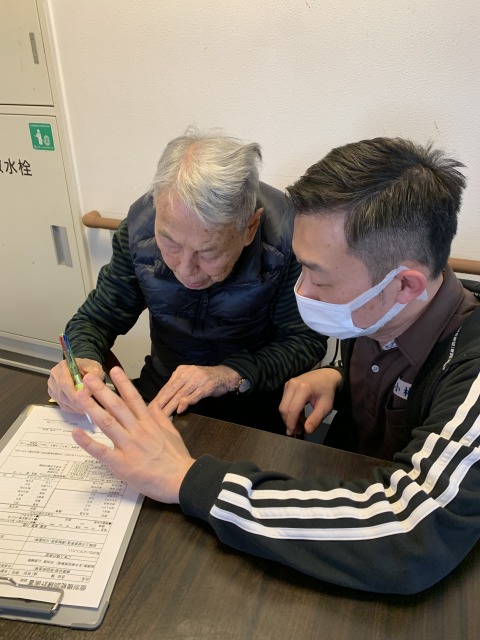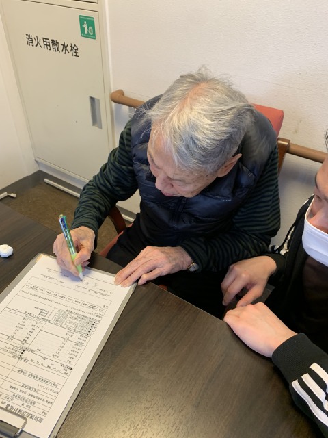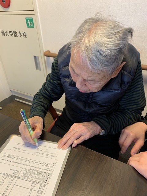 普段からケアさんや機能訓練士が書道や脳とれ、名前を書く機会を設けて字を書く機会を