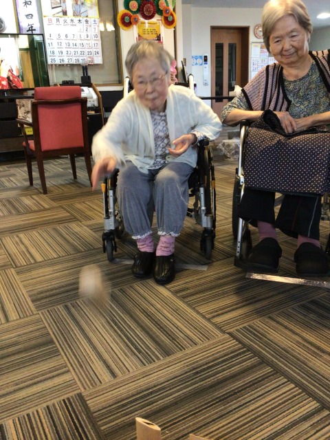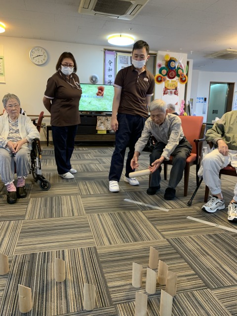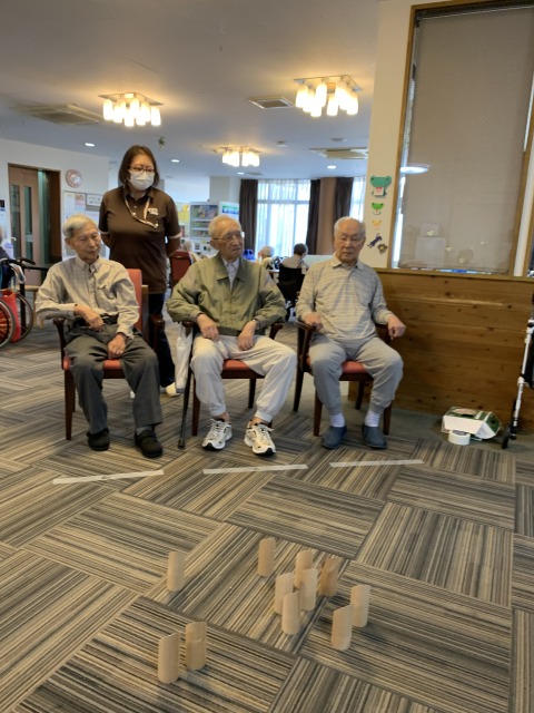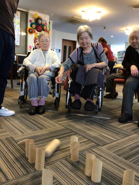 目標のスキットルに当たらず悔しがるご入居者様の姿も