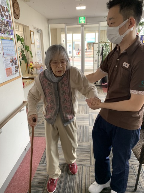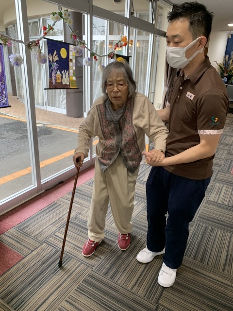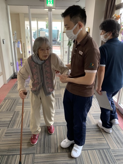 訓練士が出勤すると脚力低下予防を目的に事務所の前を