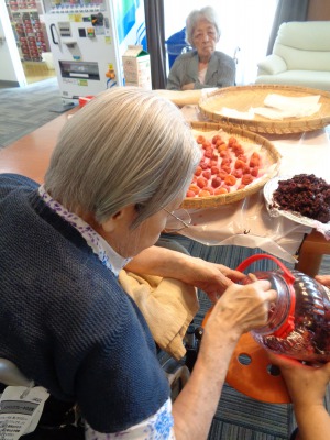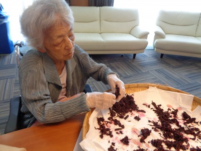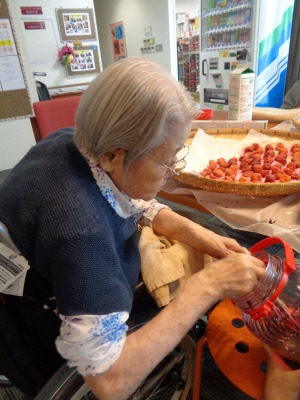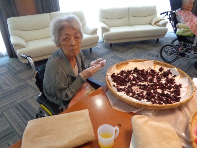 梅をざるに出している入居者様をじ~と眺めて