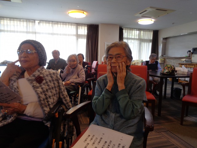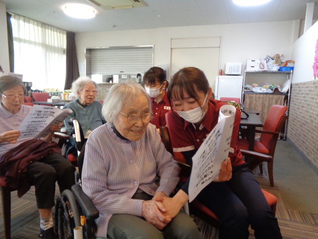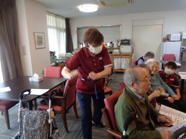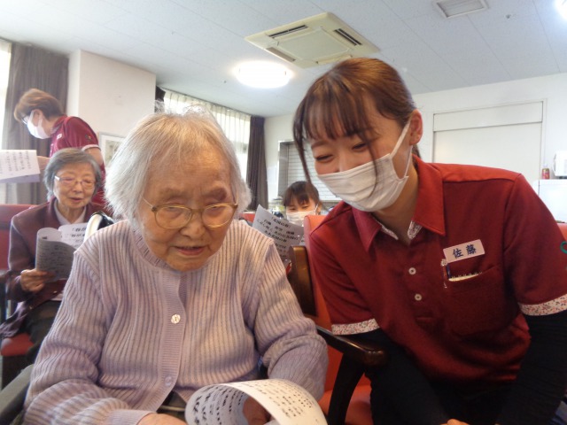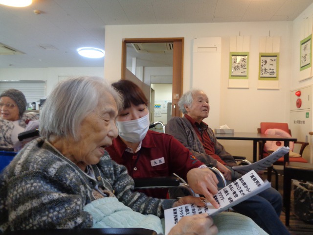 入居者様の横で、一緒に歌詞を見ながら知っている歌は