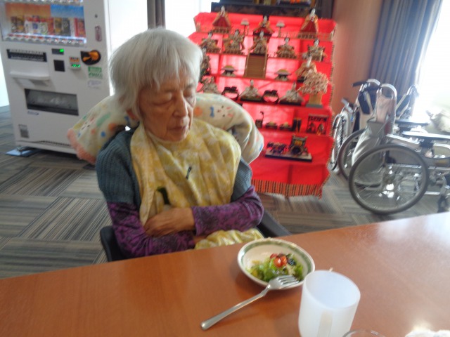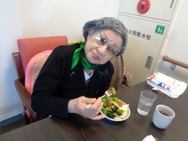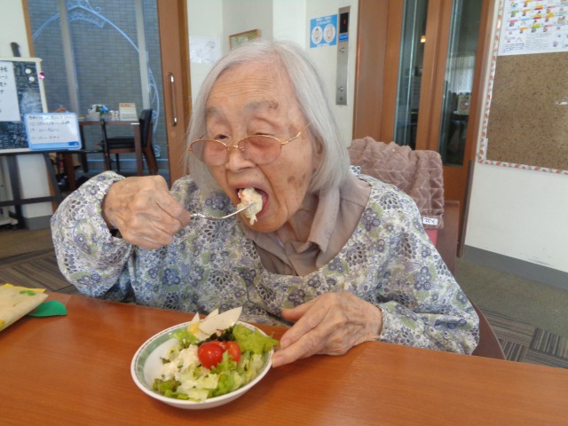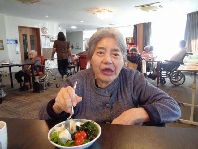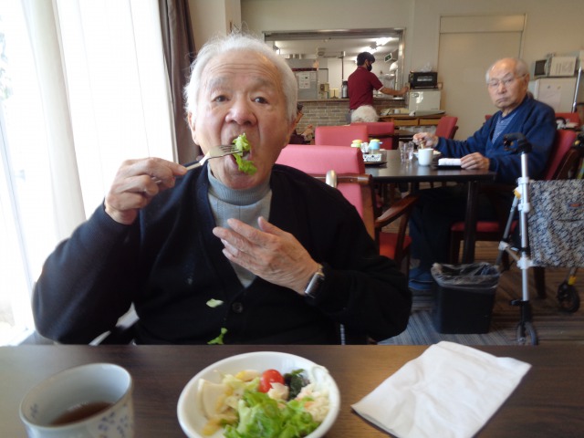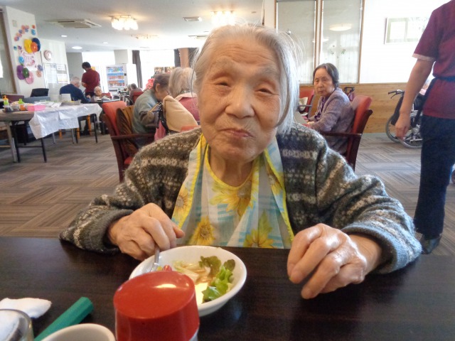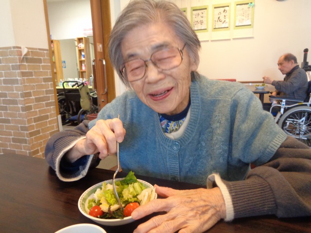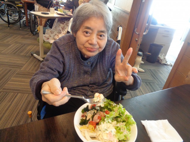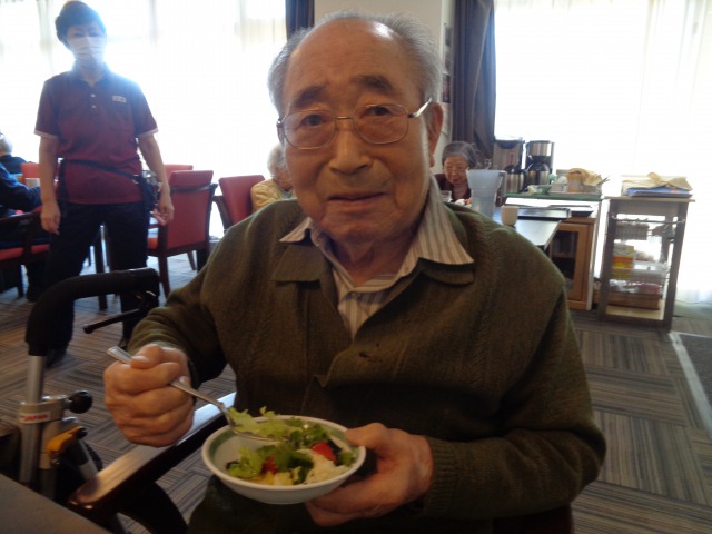 「施設長、今日のポテトサラダ、好評でしたね~お野菜ゴロゴロ入っていて‼」