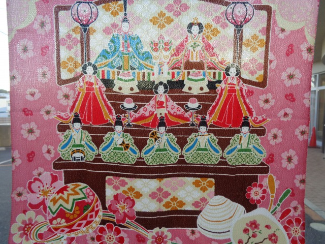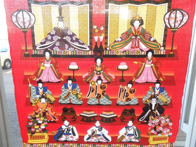 事務所の前もお雛様のタペストリーが飾られ