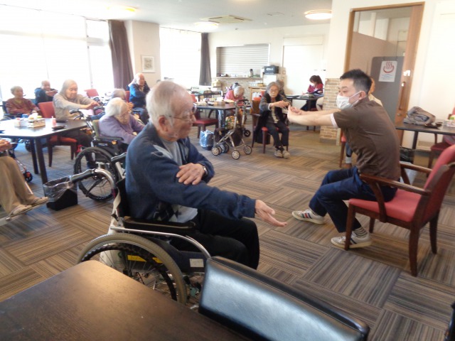 機能訓練士の掛け声のもと、ご入居者様が全身くまなく動かしていきます💪