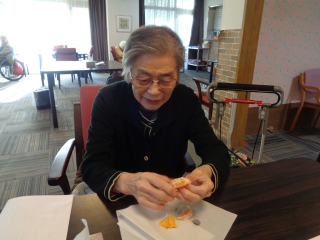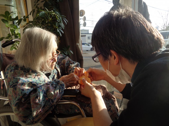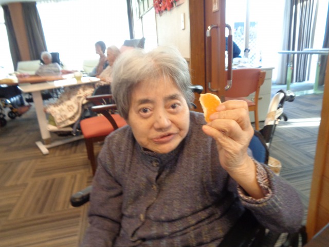 職 員「施設でとれたみかんです‼ いかがですか~?」