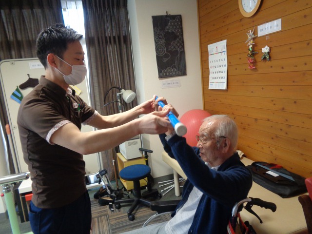 上肢の運動の為に棒を持って上に持ち上げる体操を取り入れています💪