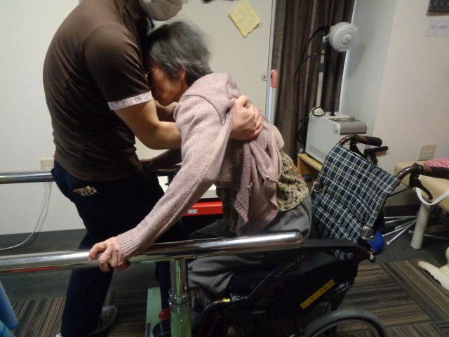 とお声が掛かり見学すると、移乗訓練として手すりにつかまり