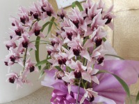 中央のお花は、ご家族様から頂いたもので、蘭の仲間のシンビジウム