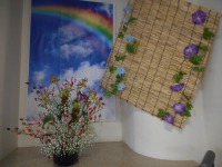 今日は雨模様ですが、柏の飾り棚は色鮮やかな生花を活けなおし、