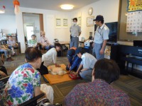 避難訓練の後半は、救急救命士の指導の下AEDを使って心肺蘇生術の訓練、