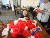 まずは、会場に飾り付けする紅白の紙花から作成です。