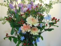 今回は、カーネーション、スカイブルー、ストック、コデマリを中心に