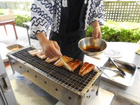 レストラン外のテラスで行い、焼いたうなぎの良い香りがレストラン内にただよい、