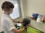 こんにちは、シーハーツ柏です。今日は、訪問理美容でお世話になっているディチャームさんの訪問日。「今日はカットをしてもらえるわ。」と、入居者様もウキウキす。 カラーやパーマなど、訪問で施行していただけるので、入居者様はとても助かっています。美容師さんとの会話も楽しみのひとつです。「○○に家が建ちましてね。」 ご家族のお話でしょうか。私たちが聞くことのない話題も飛び交います。入居者様がリラックスできるようにと、鏡のそばにお花飾りを置いてくださったり、音楽を流してくださるなど、細かい気遣いにも暖かさを感じます。今月も訪問ありがとうございました。