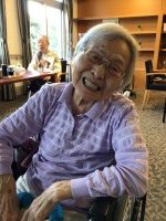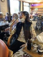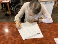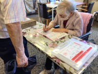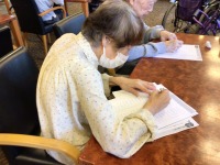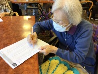 集中力が高くなる写経、先生(入居者様)が添削したところを書く直ししたりと