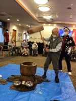「よいしょー!」のかけ声に合わせみなさんで「よいしょー」とおもちを突きスタッフが返す
