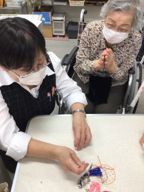 本日の刺し子部では,くるみボタンのブローチを作りました。