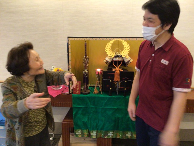 お2人でかぶとを見て楽しそうに