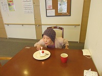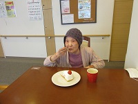 「わー!美味しそう!」と喜んで召し上がっています。ラウンジで皆さんにお祝いしていただきました。おめでとうございます!