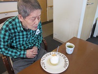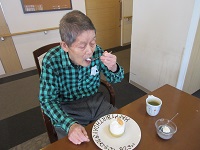 本日は、K様のお誕生日でした。K様は甘党で、日ごろからお菓子が大好きなご入居者様ですので、バースデーケーキは大喜びで楽しまれておりました。