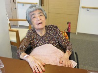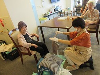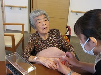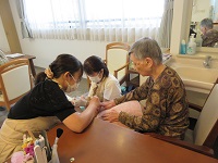 今日は看護師・整容ケアリストが施術する「ポノ」さんたちが来てくれています。他の入居者様が爪をきれいにしているところを見て「私にもやってください!」と仰っています。ネイルの色を決めている姿は女子高生のように目がキラキラされていました。