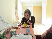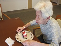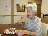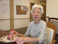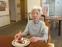 他の入居者様と「ハッピーバースデー」の歌を歌わせていただきました。「あら、いいの?ケーキなんて久しぶり!」と喜ばれていました。素敵な笑顔をありがとうございました❤