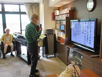今日はいつもの先生がお休みでしたが、皆さん元気よく歌ったり手足を動かしたり楽しんでいらっしゃいました。K様には「加山雄三」になりきっていただきセリフを仰っていただいています。