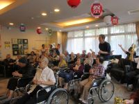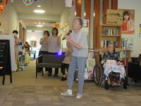 夏祭りの午後は歌合戦を行いました。ご入居者様は、得意な歌の歌唱を行い、スタッフは夏祭りや盛り上げる曲を選曲して会場を楽しませていただきました。
