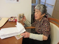 妹様より贈り物が届きました!きれいで色々な切手をたくさん貼って、きれいな花の絵ハガキに2枚使って書いてくれています。美味しそうなおやつを入れてくださっていて、「これ、他のみんなにもあげたい」と仰っています。
